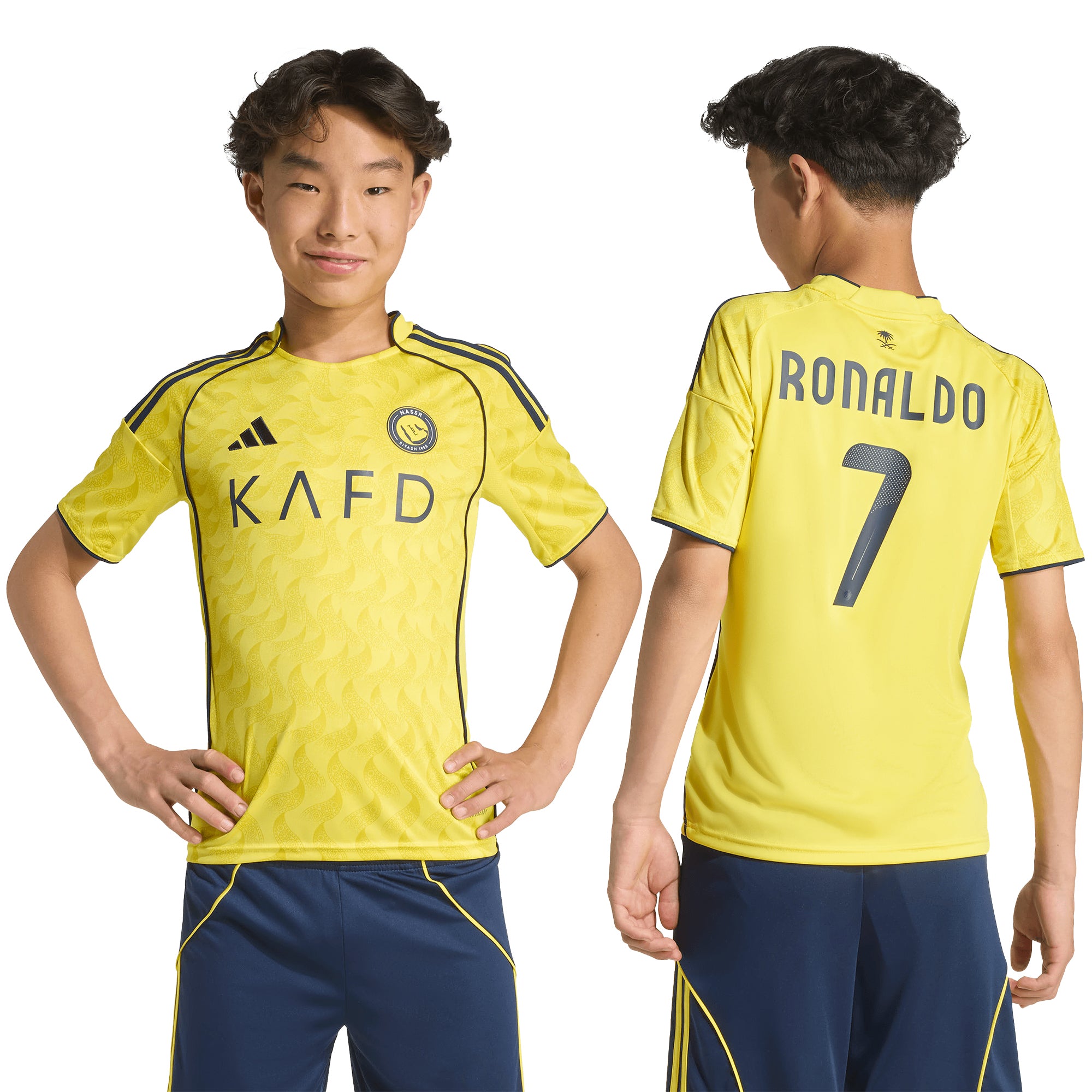 Its radiant design draws inspiration from the blazing Riyadh sun and its soft fabric and moisture-managing AEROREADY ensure young fans stay comfortable while they shout their support. On the chest, a club crest shows your loyalty.