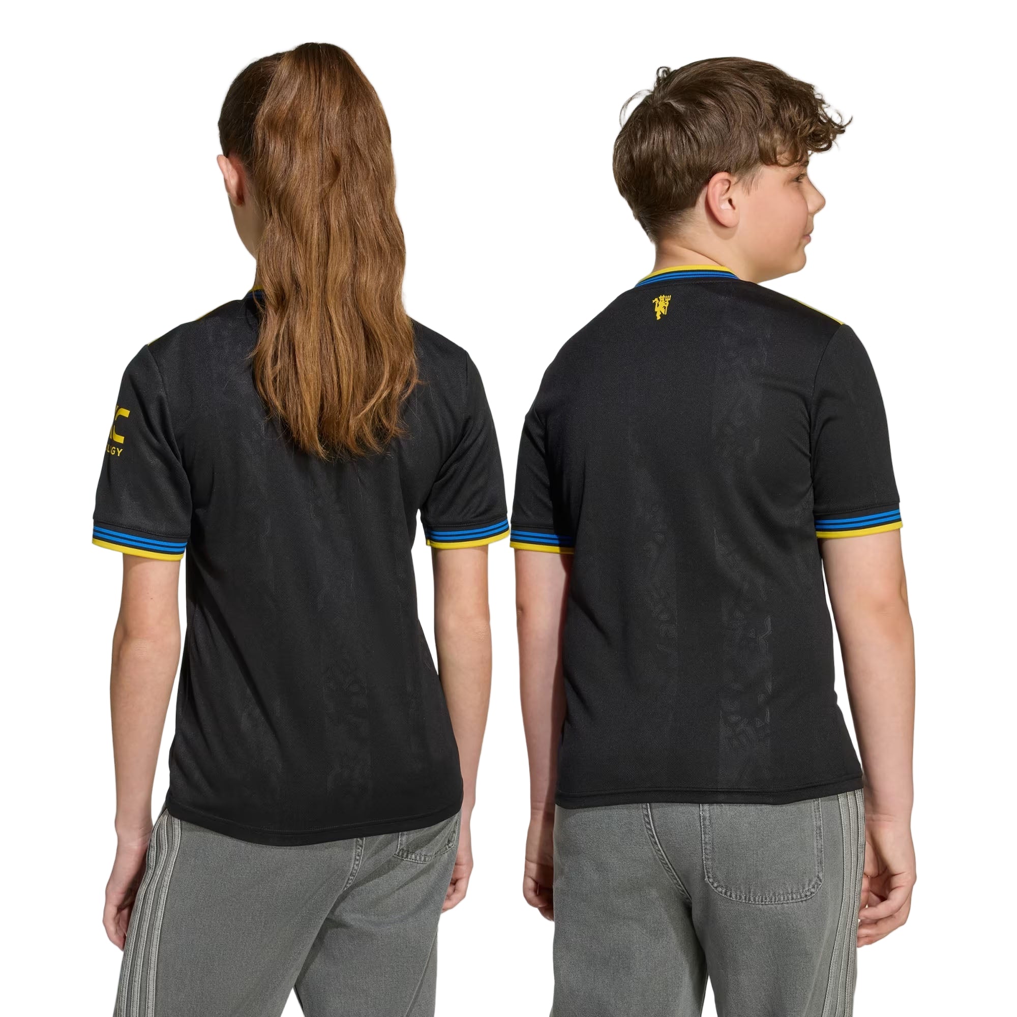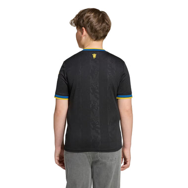 Finished in black, this juniors' Manchester United third jersey conjures some of the club's most iconic players and memorable away performances.