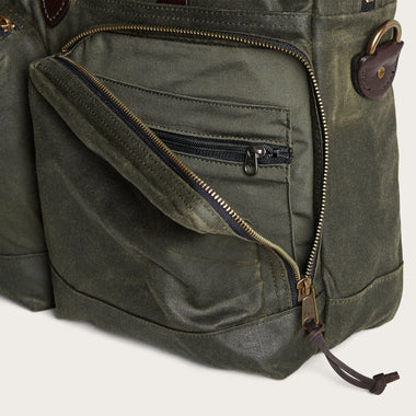 For decades, Filson's oil finish Tin Cloth has excelled at sheltering foresters, miners, and sportsmen from wet and abusive conditions – so be you can be assured your gear will be well-protected in all your travels. The waxed canvas is thoroughly saturated with our oil finish, creating a barrier that repels rain, snow and mud. Tin Cloth’s resistance to abrasion and tearing is legendary, and it's the ideal material for a lighter-weight bag that withstands the tests of time and mileage.