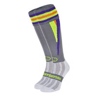 Flash Harry WackySox are grey knee length socks with a fluorescent streak down the side of each leg in purple, orange and fluorescent yellow. There are purple, orange and fluorescent yellow hoops in the turnover top and a fluorescent yellow Wacky face logo on the front of the ankle.