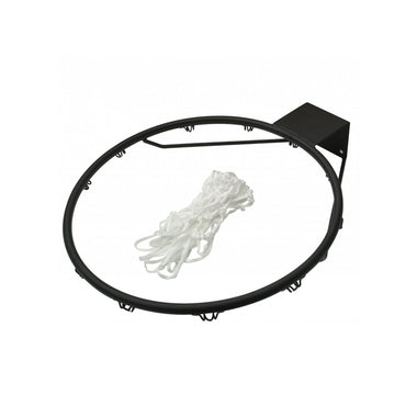 A fan-shaped board with a cool red, white and blue design. The backboard is made of strong polypropylene for durability and measures 35” x 24” x 1.3” (90 x 60 x 3cm). This is combined with a black 18” (45cm) steel ring with a white 12 loop nylon net and is suitable for all basketballs up to the official size 7.