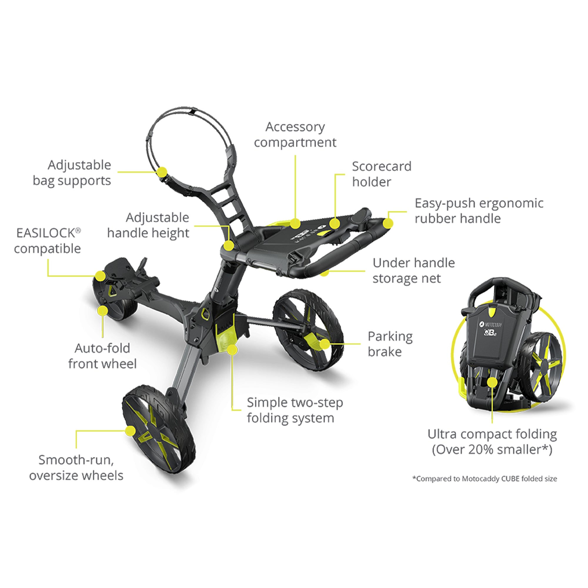 Boasting an ultra-compact folded size 20% smaller than the Motocaddy CUBE, its innovative 2-step folding mechanism and auto-fold front wheel allow it to be set up or packed away in seconds, making storage and transportation easier than ever before.