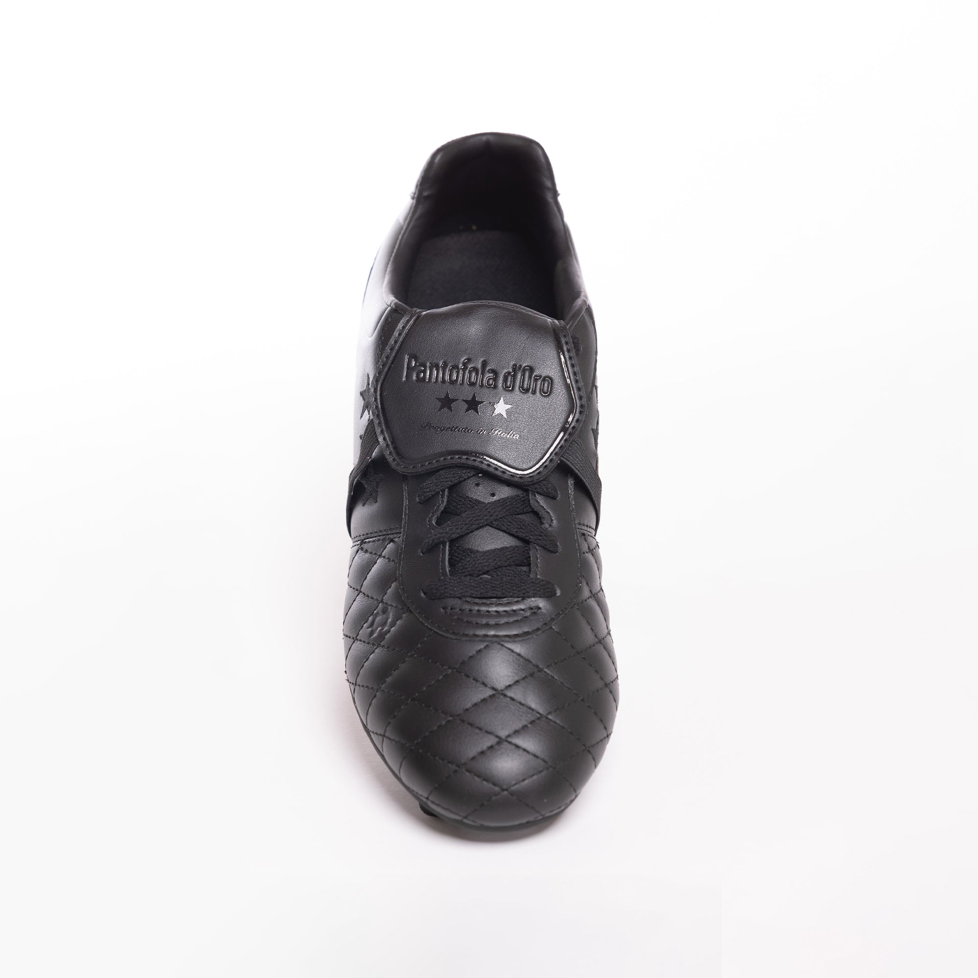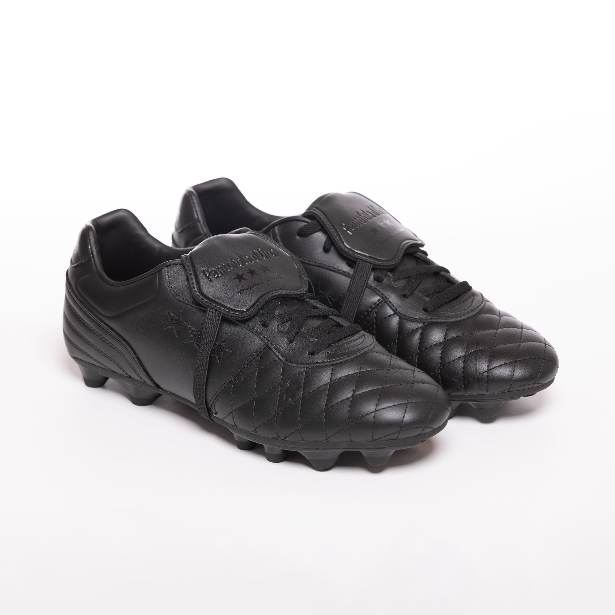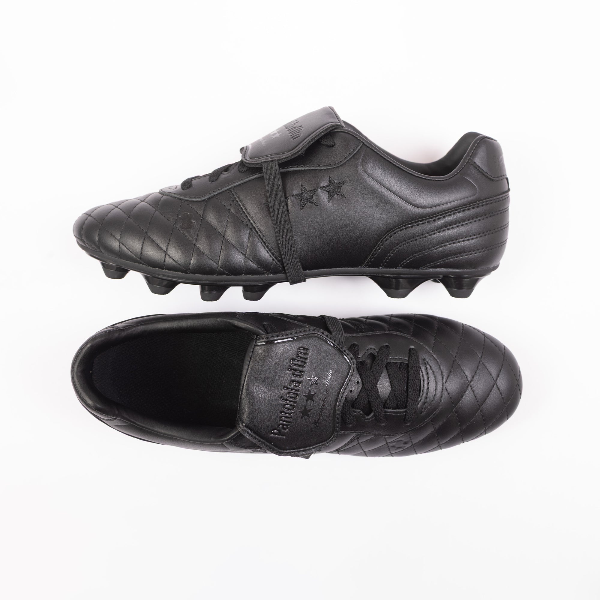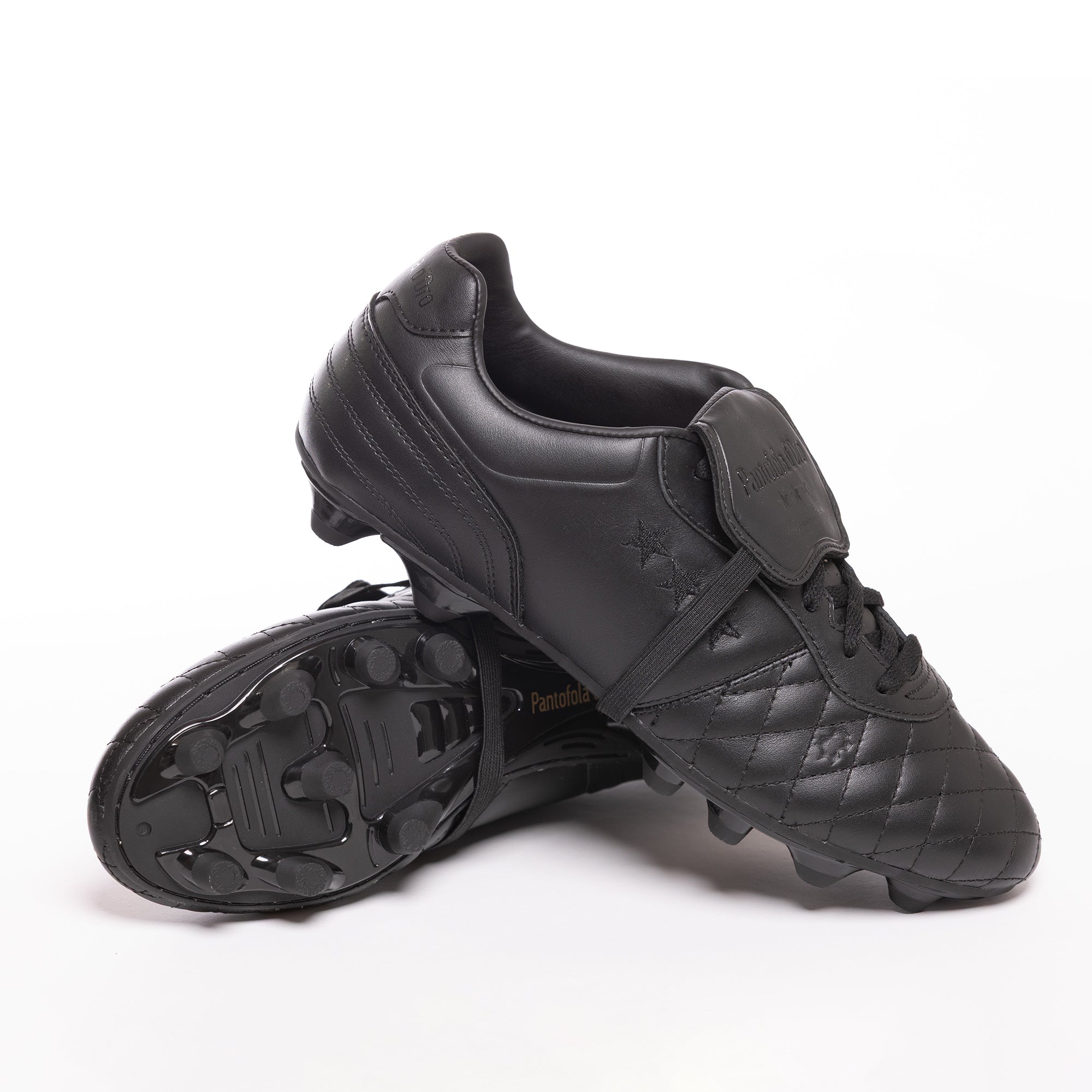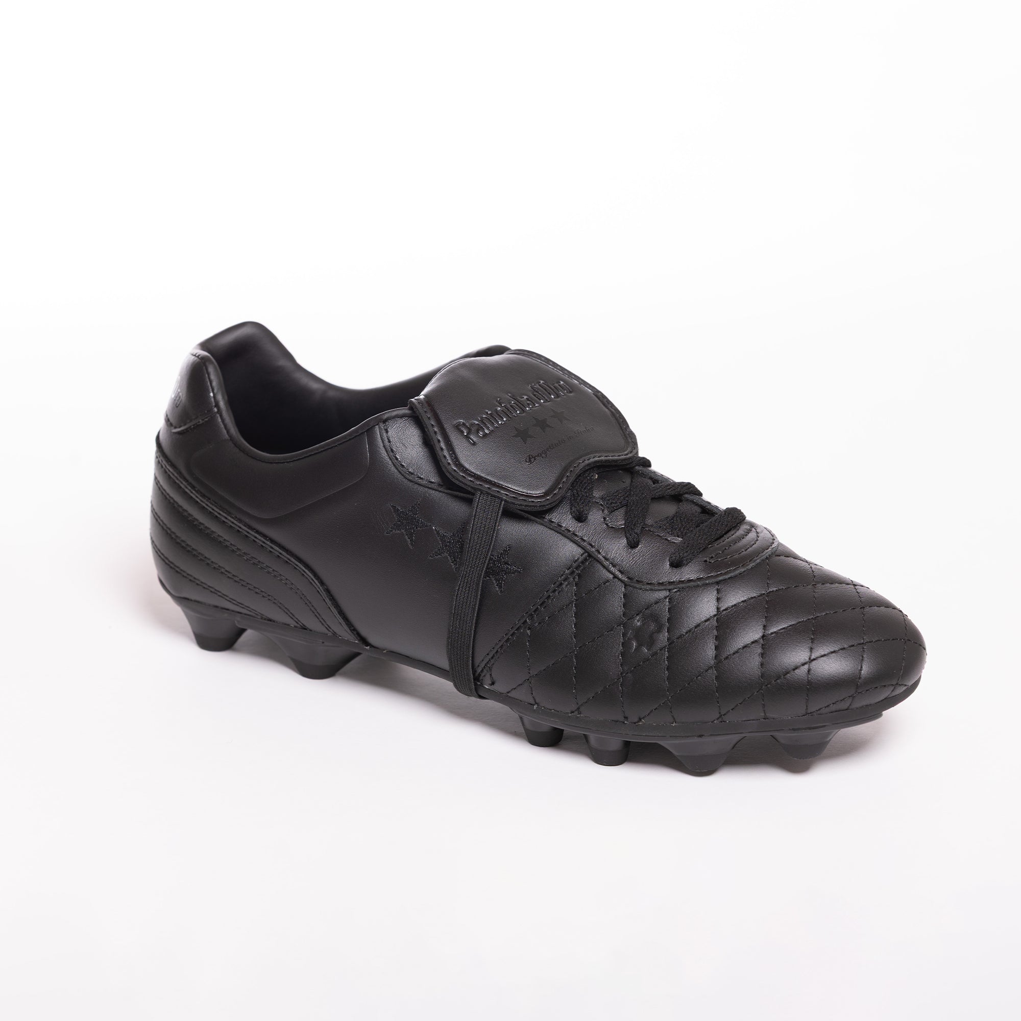 The classic foldover tongue with elastic strap guarantees a clean strike, while the removable compression-moulded sockliner provides superior cushioning. Adorned with Pantofola d’Oro and Tri-Stella branding, this luxurious boot combines timeless style with conical plastic studs designed for optimal stability and grip on firm ground.