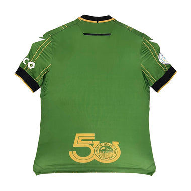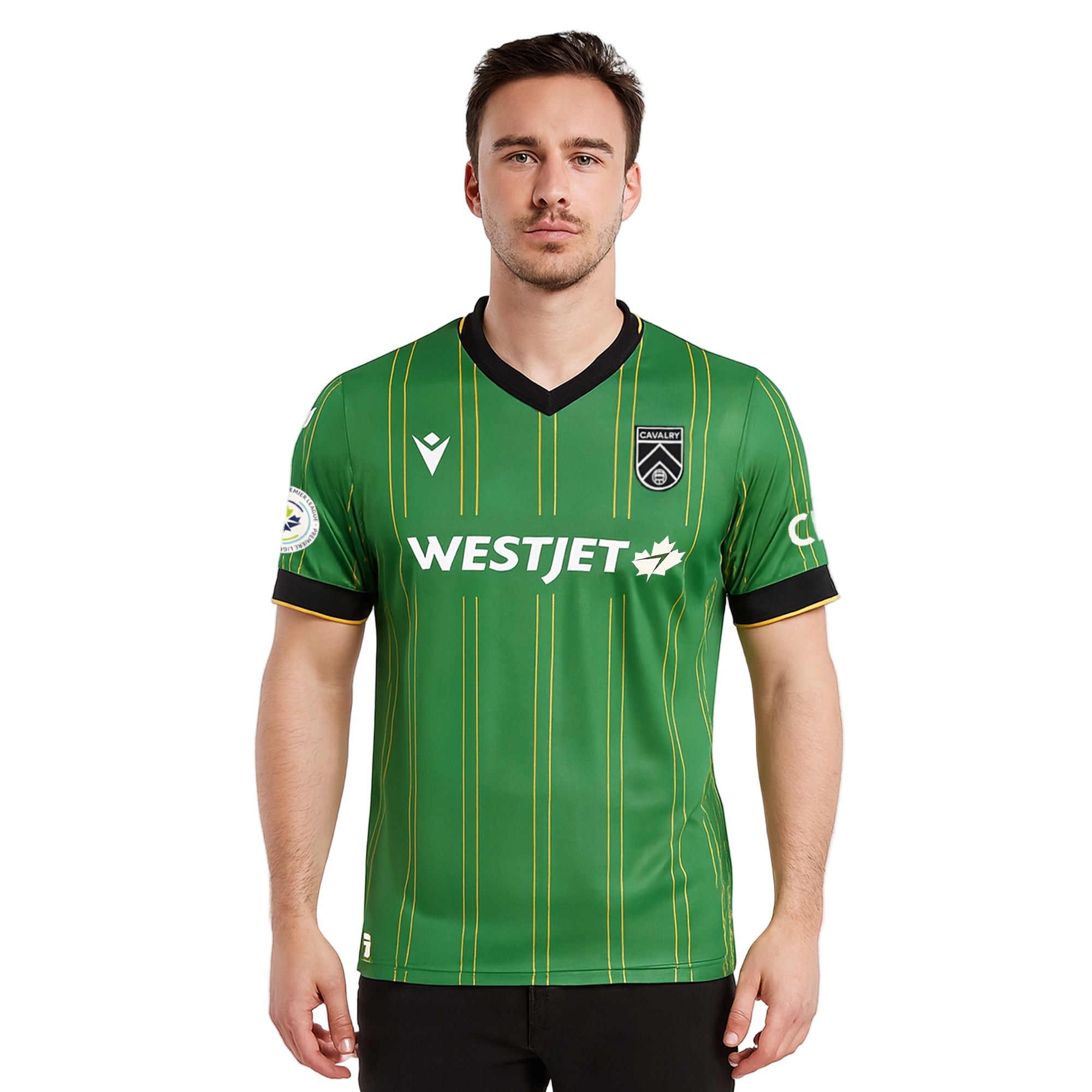 The front of the jersey boasts a black Cavalry FC crest and seven gold pinstripes, symbolizing both the 50 years of excellence at Spruce Meadows and the seven remarkable seasons of the Cavs, including their triumphant 2024 CPL Championship win.