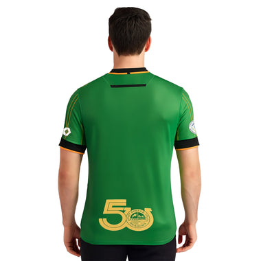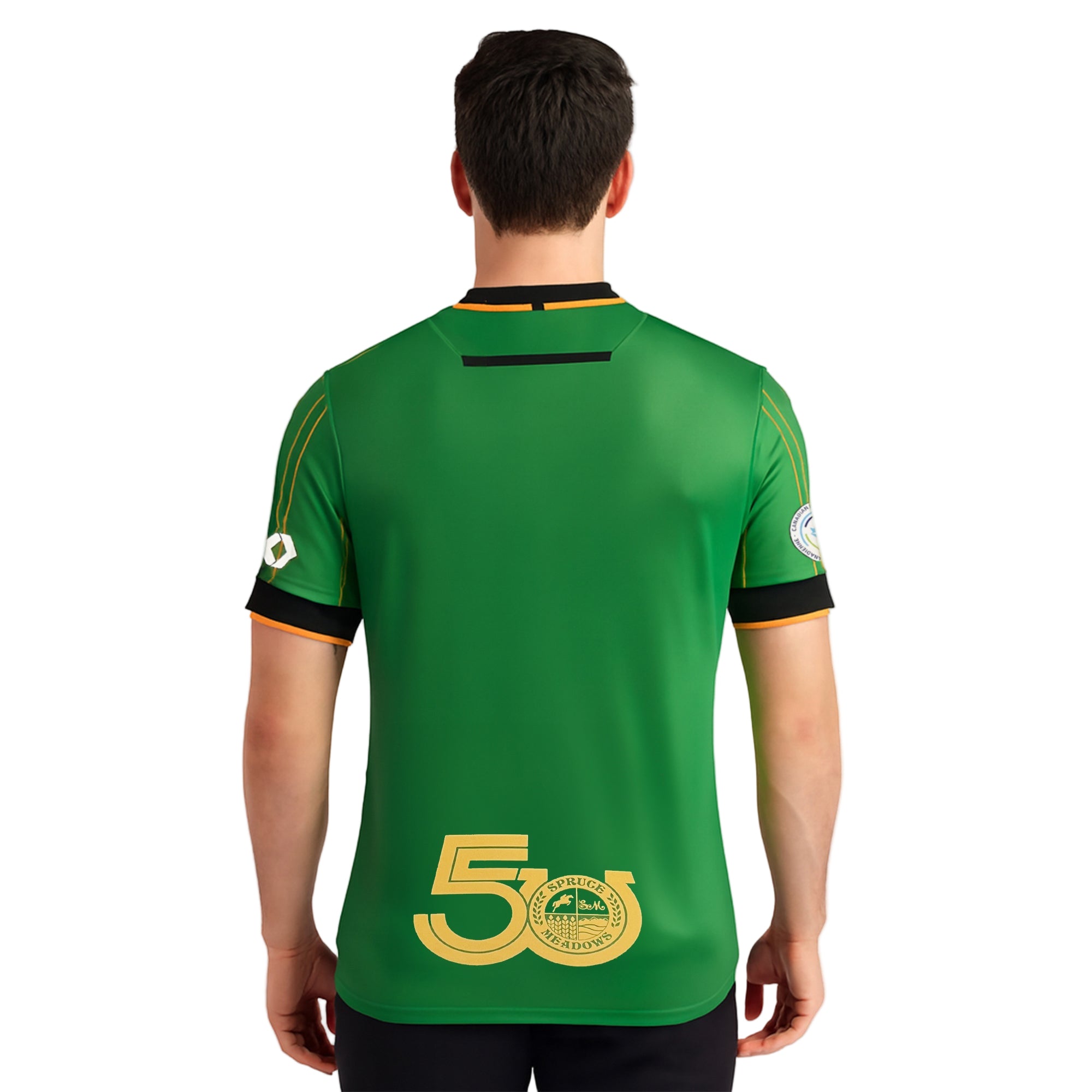 This limited-edition kit, featuring the iconic Cavalry Green base with sleek black detailing at the collar and sleeves, celebrates the 50th Anniversary of Spruce Meadows as the proud home and heritage of the Cavs.