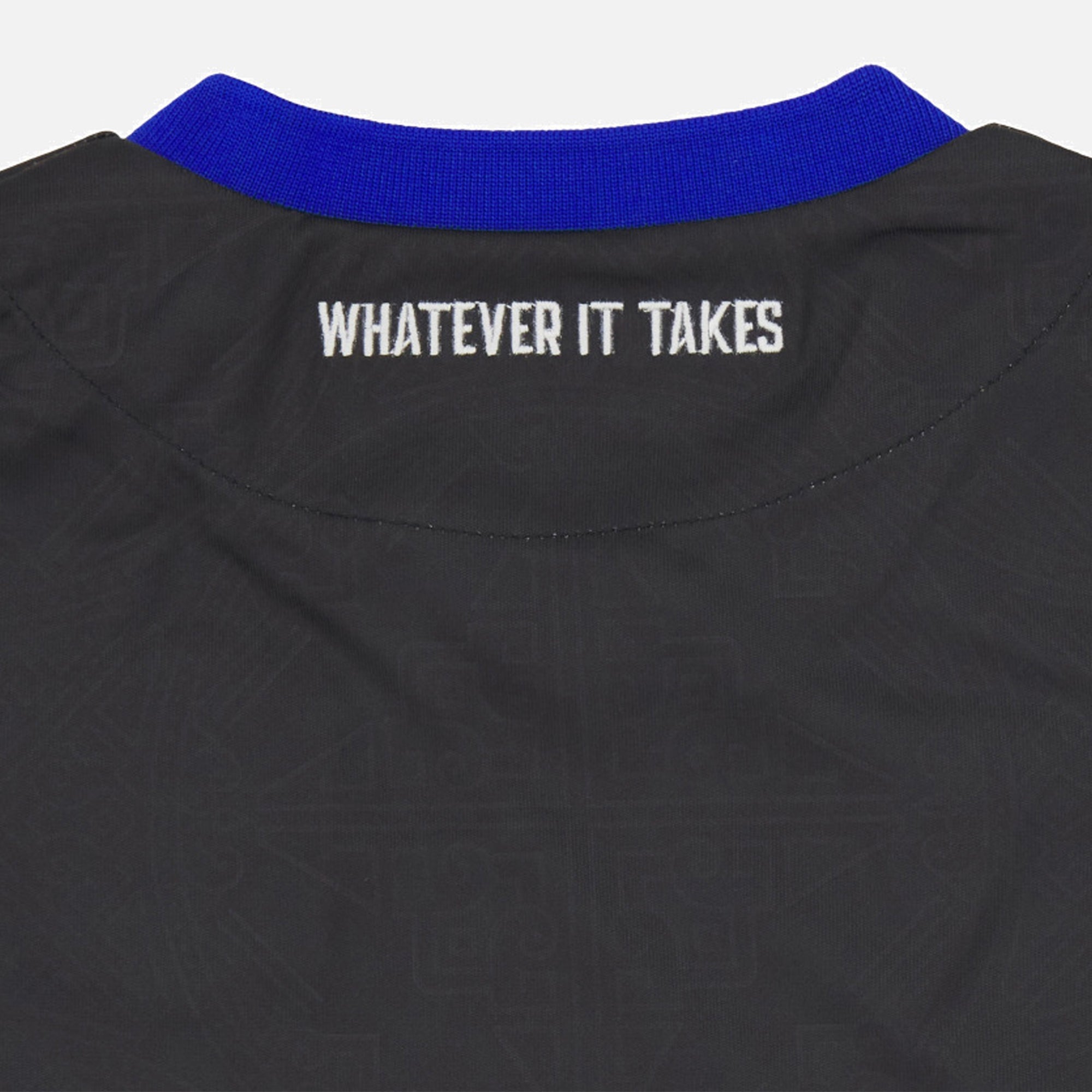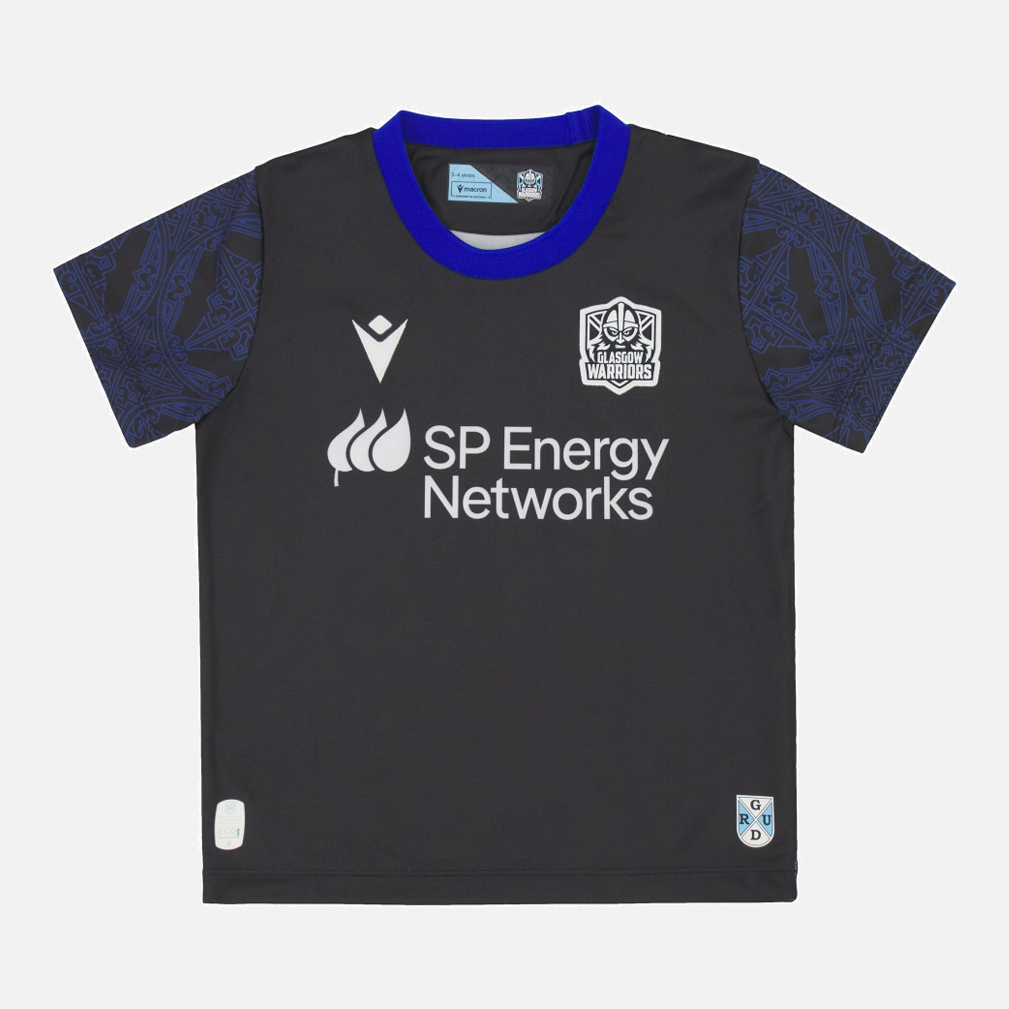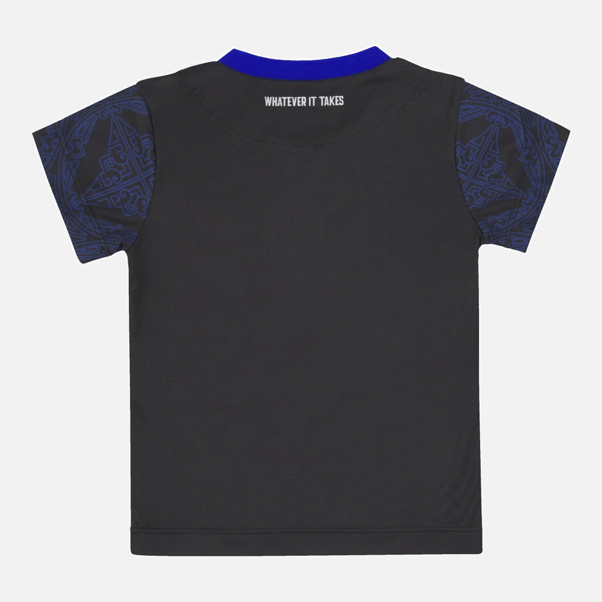 2025/26 home kids shirt - Black infant shirt with bold blue highland shield design over the shoulders, the shirt features a korean style collar with the same highland shield pattern embossed over the body and club crest placed over the heart.