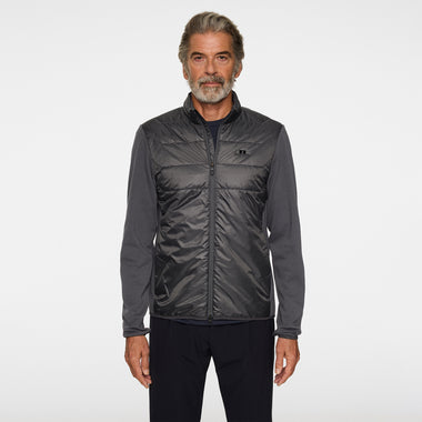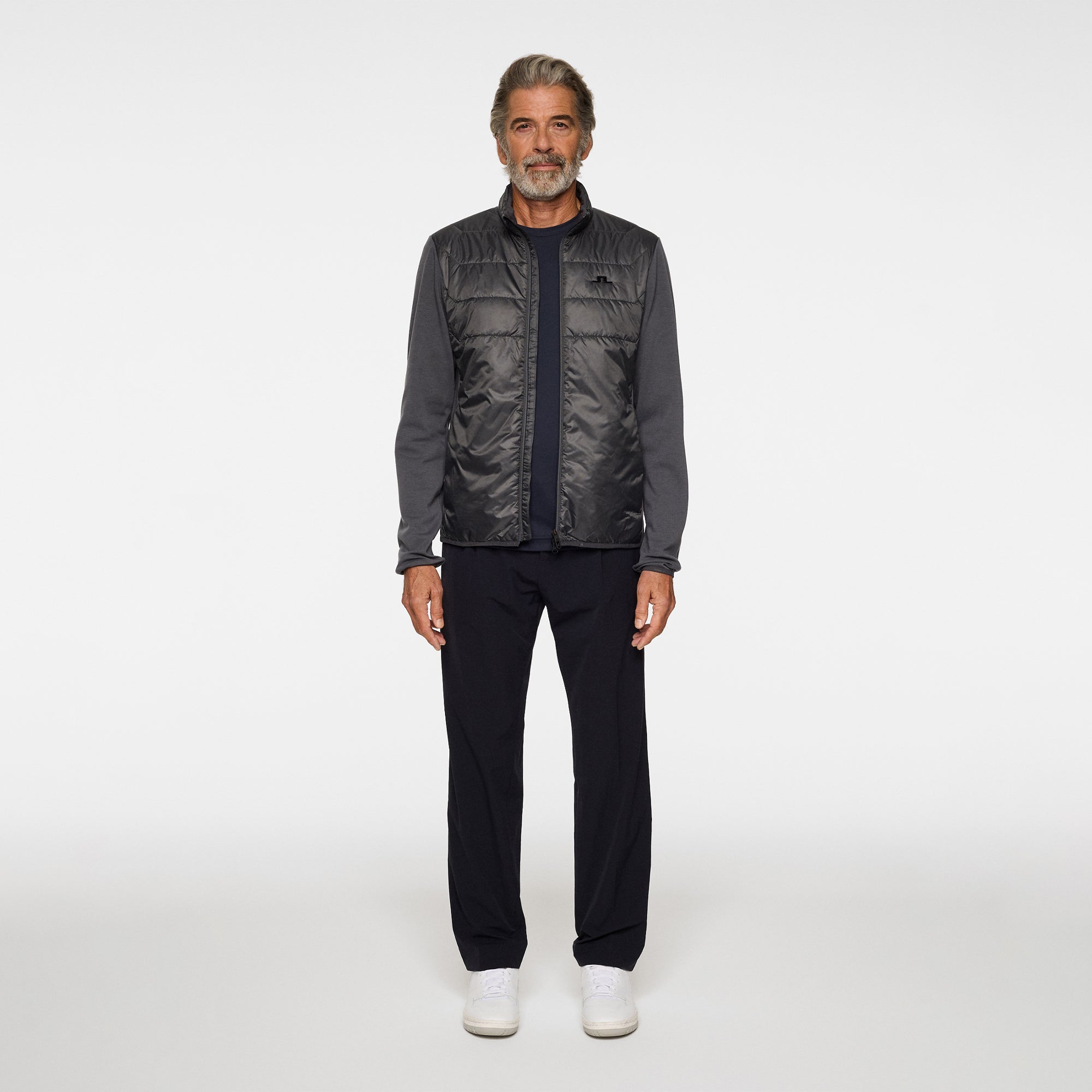 Luxury layering with tech benefits. The Gregory Hybrid Jacket features merino wool blend panels, fleece interior, and a water-repellent finish. Perfect for city-to-slope transitions.