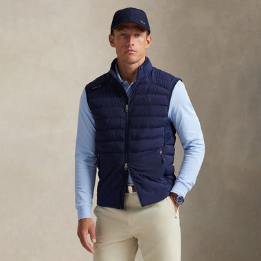 Crafted from water-repellent fabric, this lightweight gilet is ergonomically panelled with stretch jersey for ease of movement and insulated with down-alternative fill.