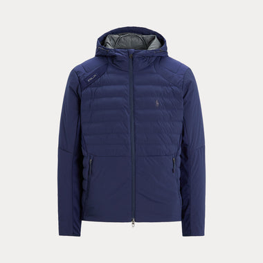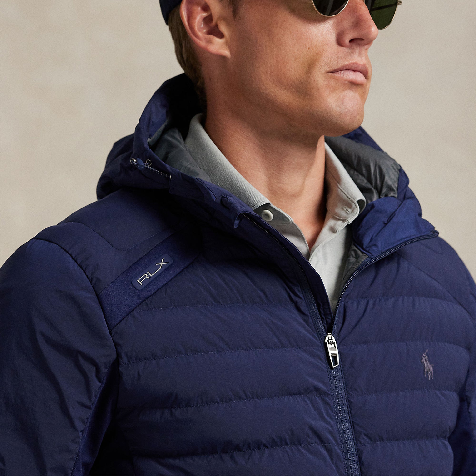 Crafted from water-repellent fabric, this lightweight jacket is ergonomically paneled with stretch jersey for ease of movement and insulated with down-alternative fill.