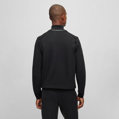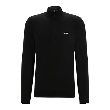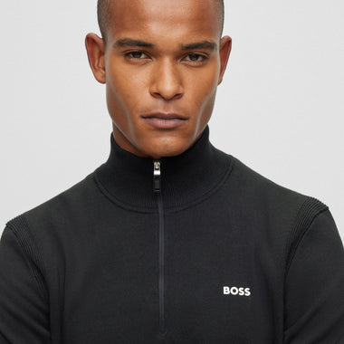 A zip-neck sweater in a straight fit by BOSS Menswear. Featuring a contrast logo print, this layer is created in a breathable stretch blend. This product is partly made with organic cotton. Our organic standards do not allow the use of synthetic fertilisers, pesticides or genetically modified seeds.