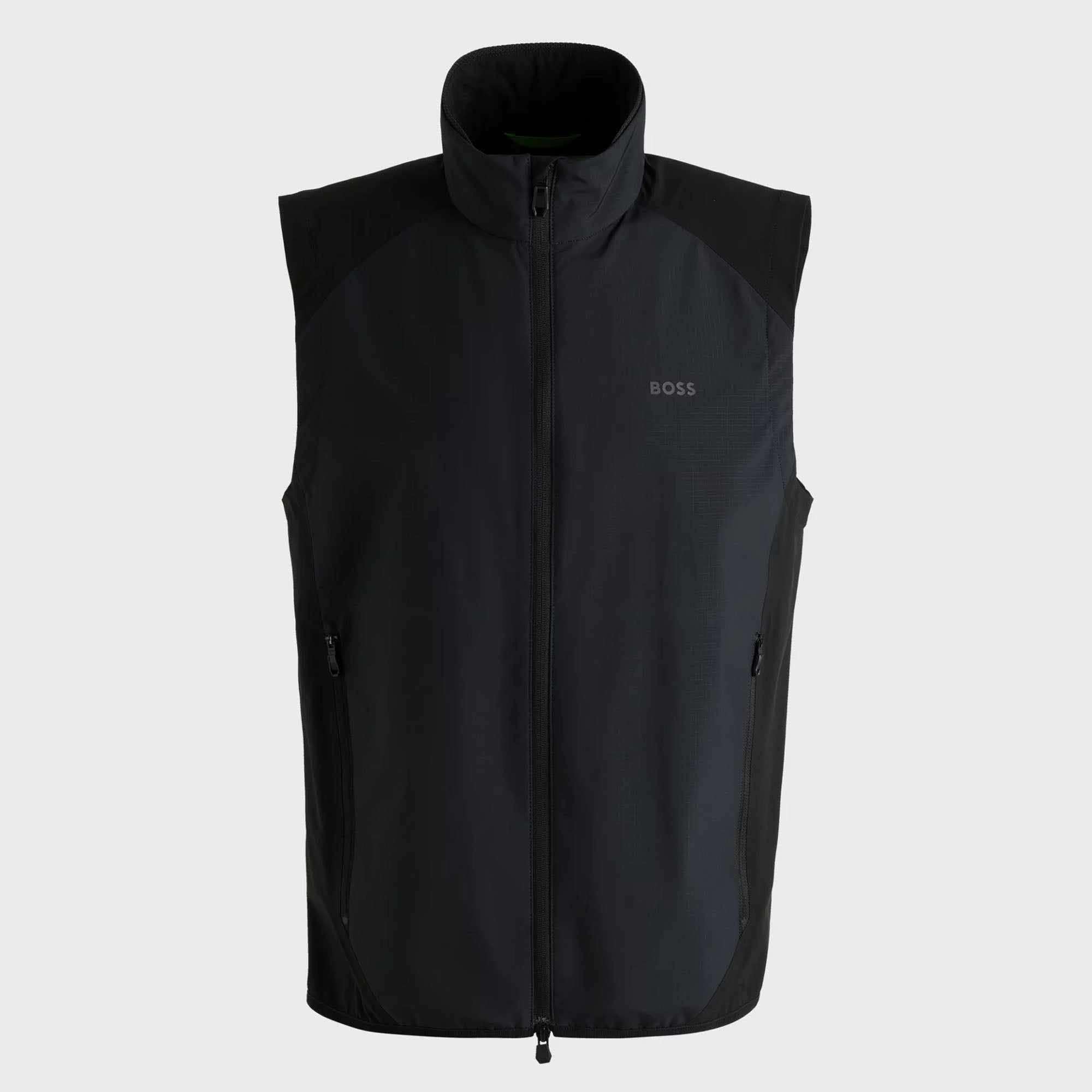 This BOSS Menswear golf vest offers protection when it rains and secure storage for valuables. Versatile two-way zip. Elasticated hem. Decorative reflective details.