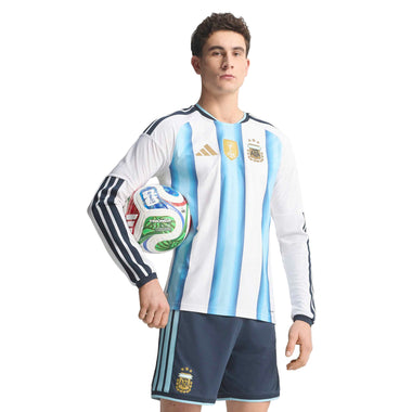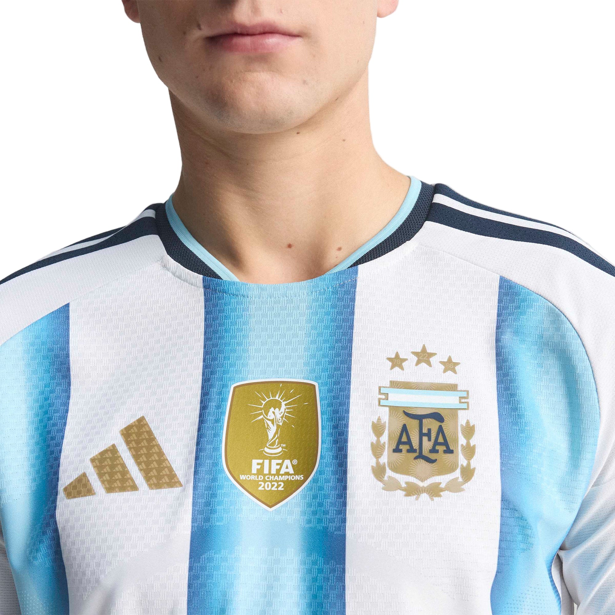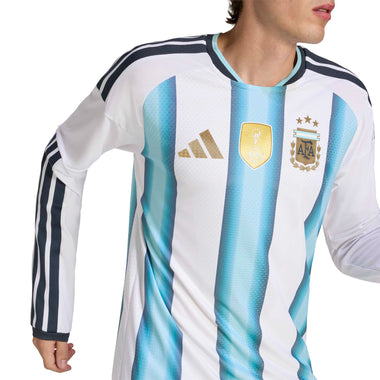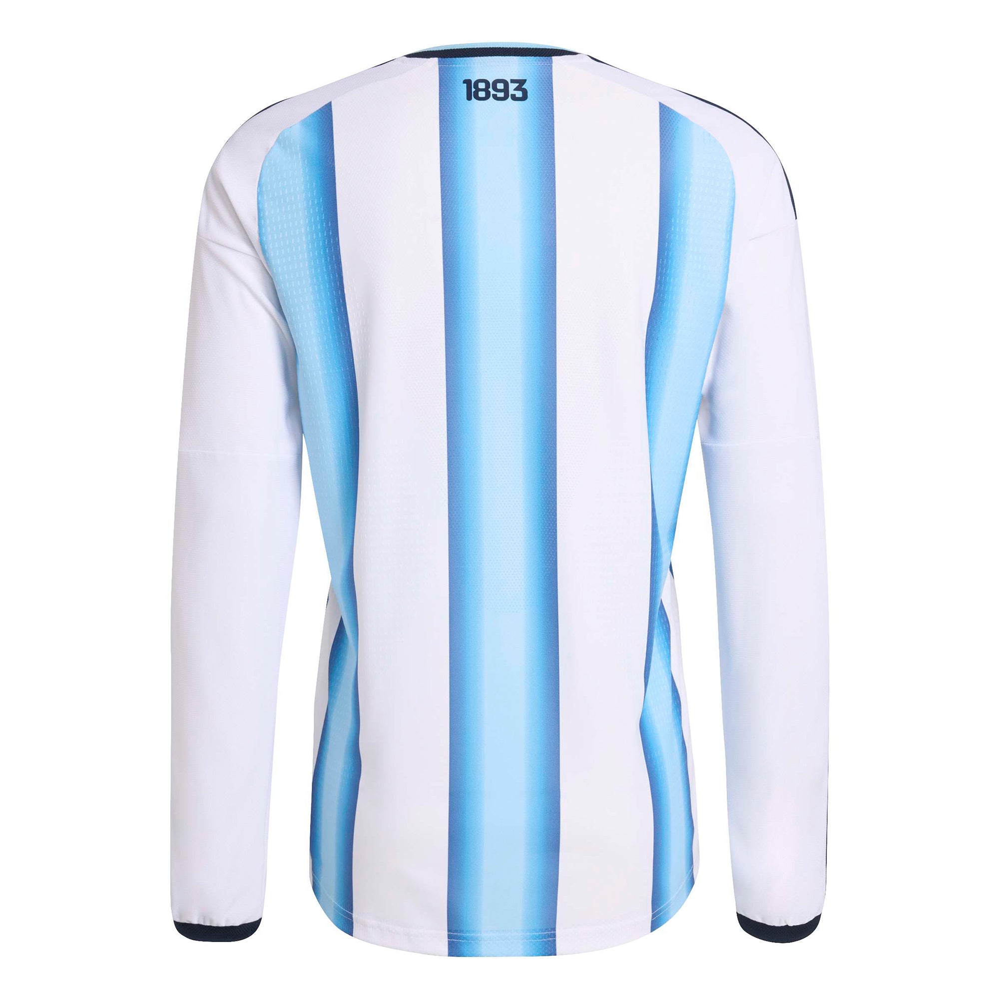 The Argentina 26 Home Authentic Long Sleeve Jersey celebrates the World Champions and football DNA of Argentina. This jersey is a tribute to the team's legacy, inspired by those used in the three World Cup victories ('78, '86, '22). Complemented by matching shorts and socks, it proudly displays the Fed year of foundation as a sign-off.