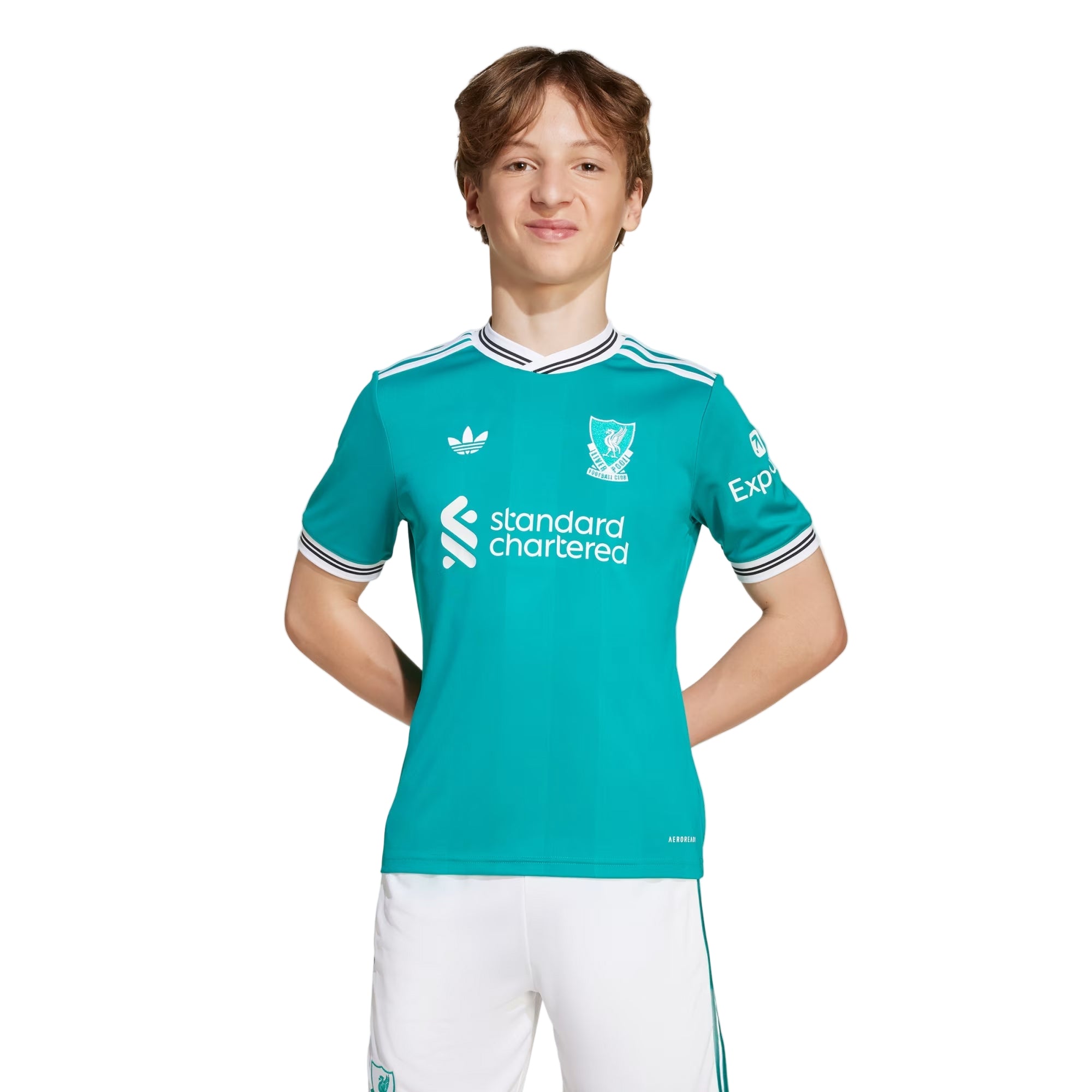 The tonal vertical stripes on this juniors' third jersey come in unmistakable adidas Equipment green. On the chest, that vintage club badge shares the spotlight with a Trefoil for the first time since 1991. Created for travelling Reds, this shirt includes moisture-managing AEROREADY so it feels as good as it looks