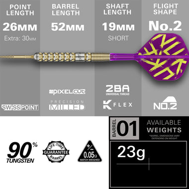 The high-density 90% Tungsten barrels are precision-engineered and meticulously re-machined to create an intricate combination grip, incorporating Pixel grip technology. Finished with spot UV and foil accents, performance coated to enhance durability and visual aesthetic.