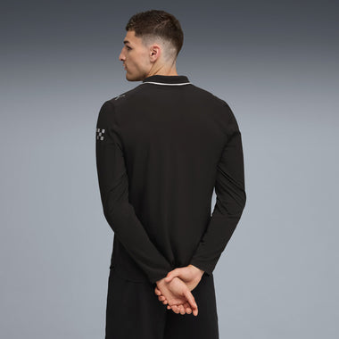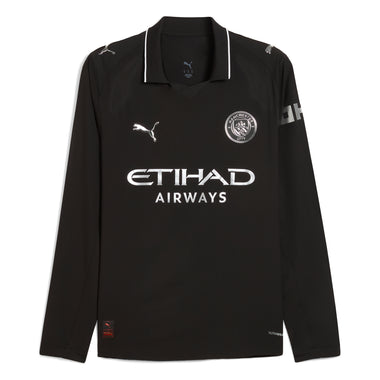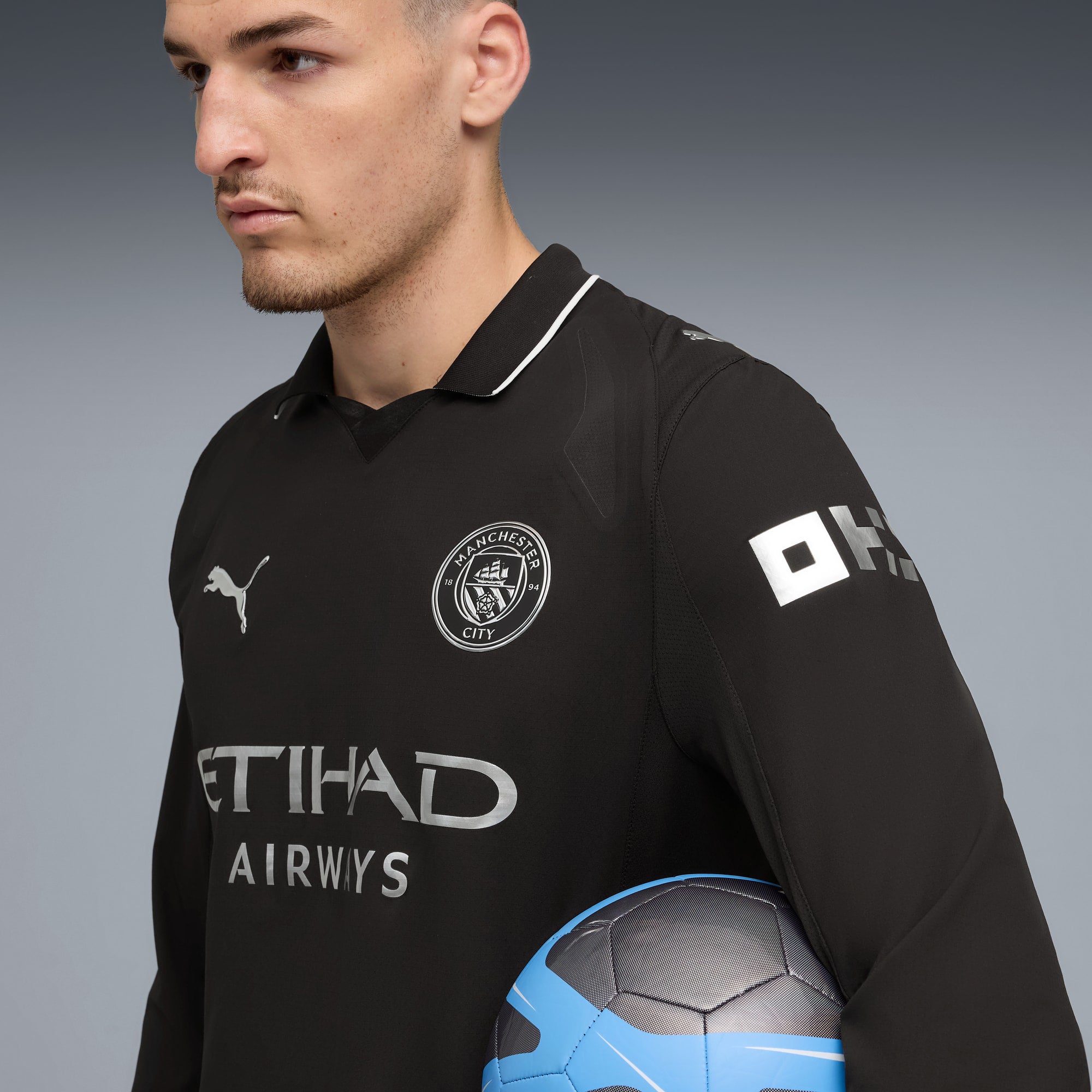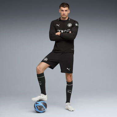 The 25/26 Away Kit is a tribute to the early Cityzens, reimagined with a nod to the club's innovative spirit. The all-black design takes inspiration from that historic kit, combined with metallic details to celebrate the timeless essence of Manchester City Football Club.