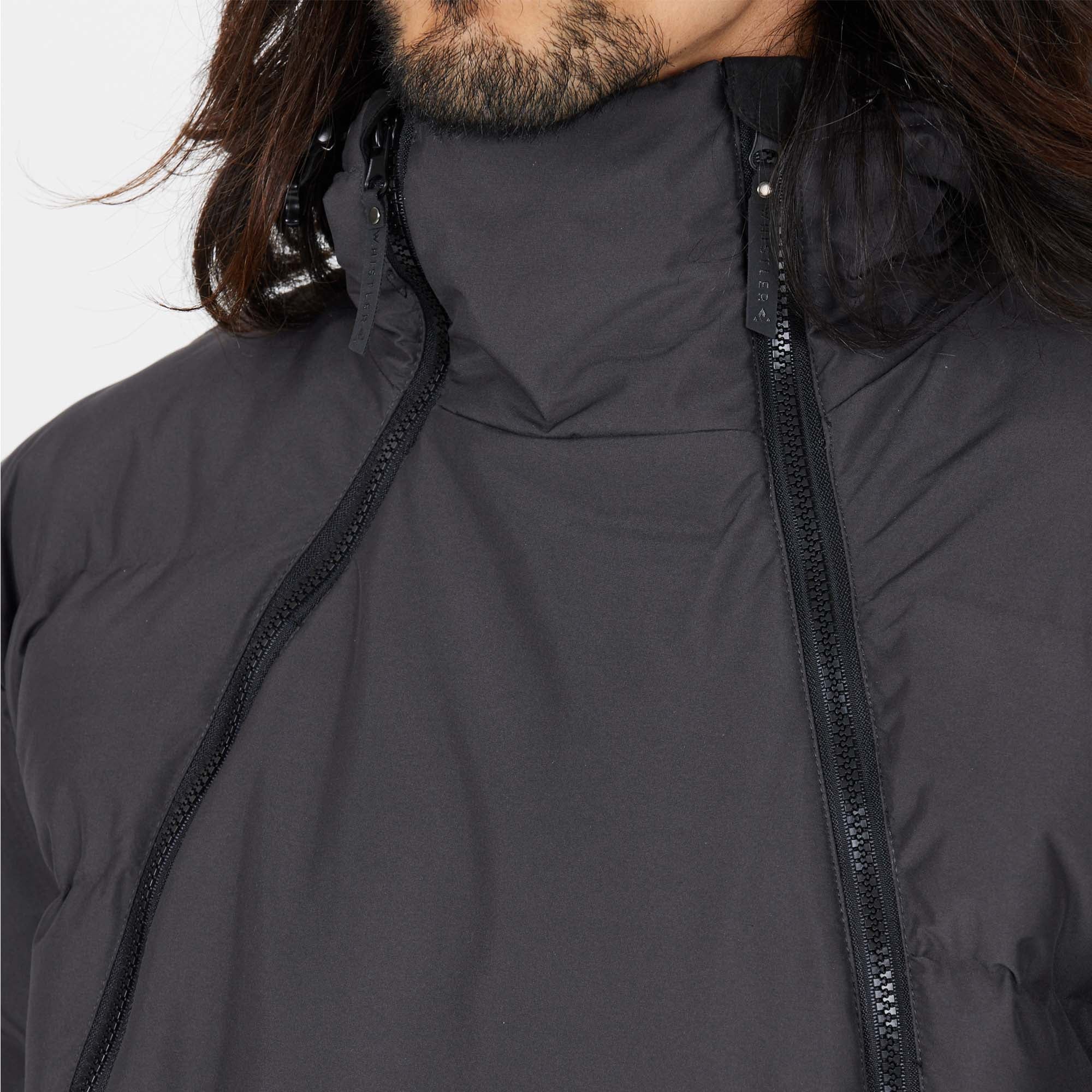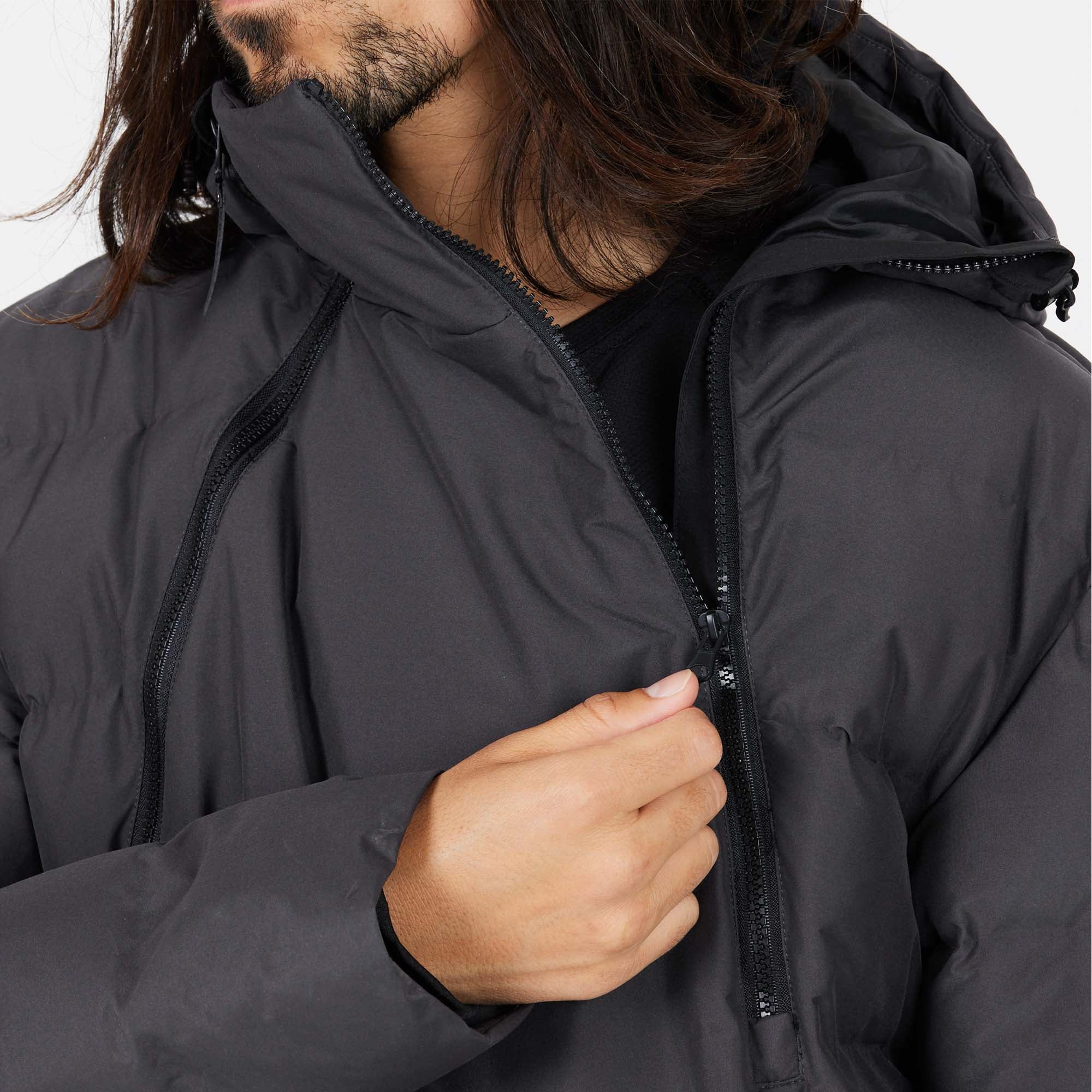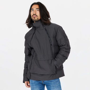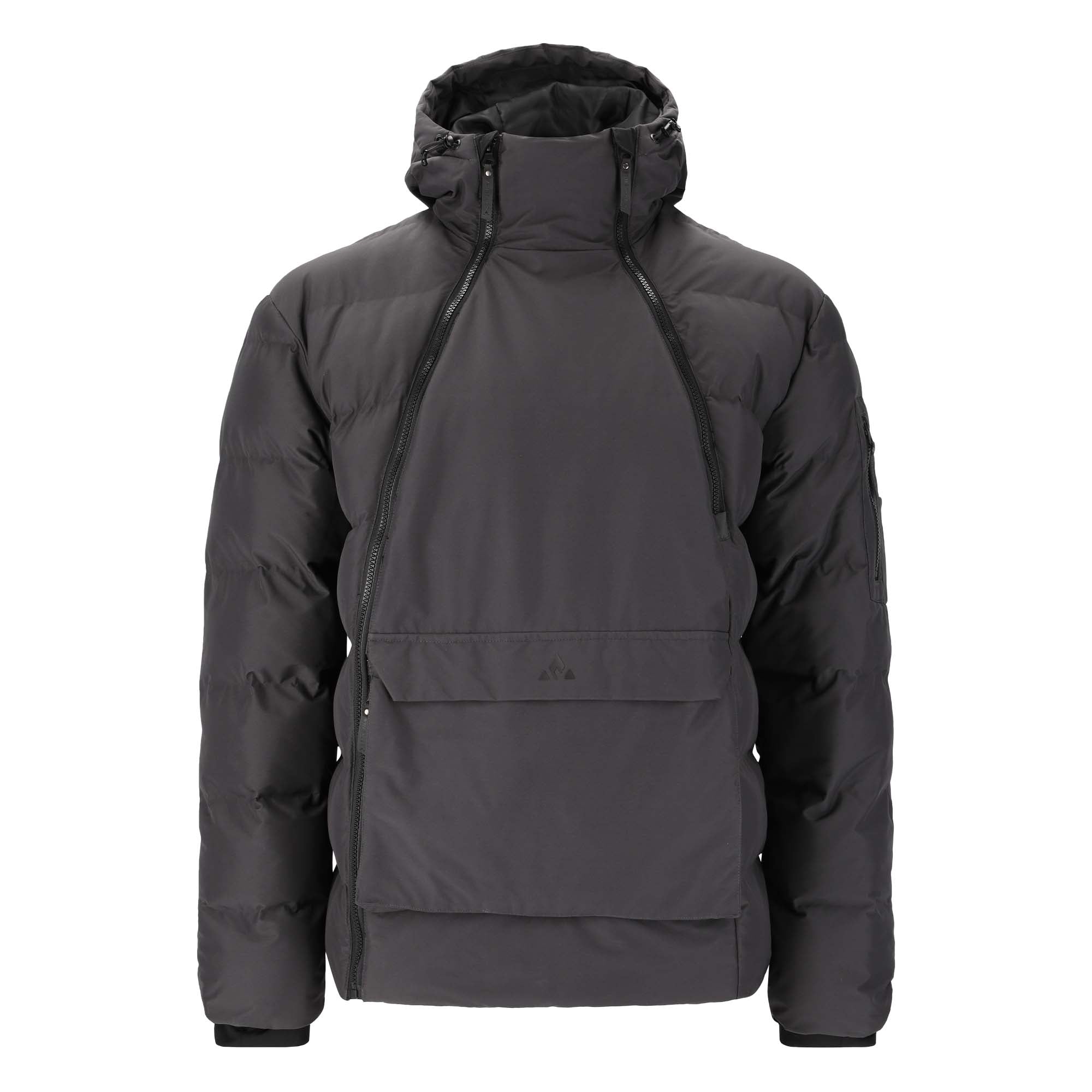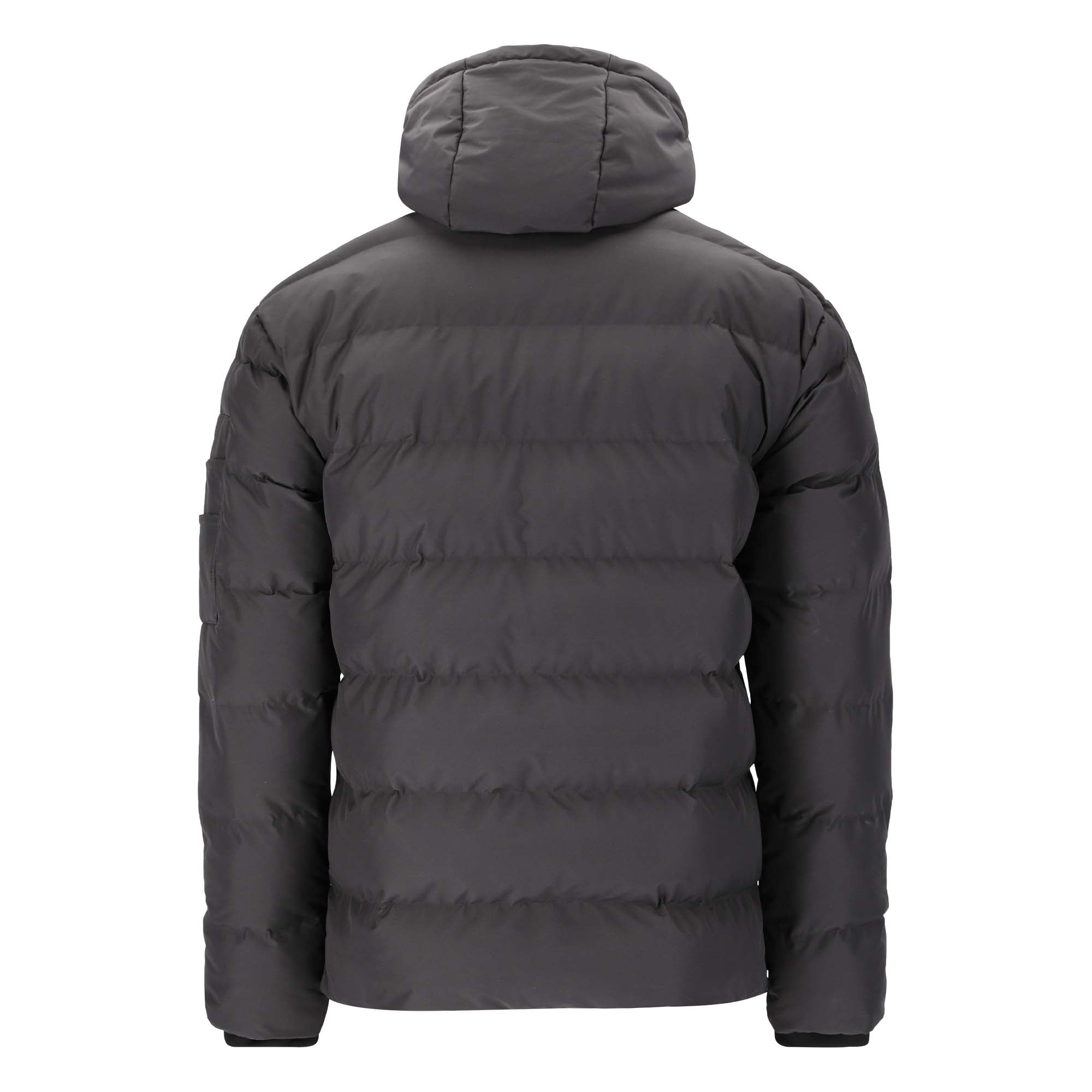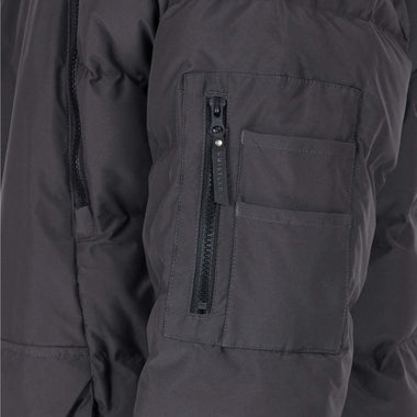 The jacket includes multiple pockets: two zippered, one with flap and Velcro, plus a zipped sleeve pocket and two open sleeve pockets for versatile storage. Finished with cuff closures and a drawstring hem, this men's jacket ensures a secure fit while keeping you protected from the elements.