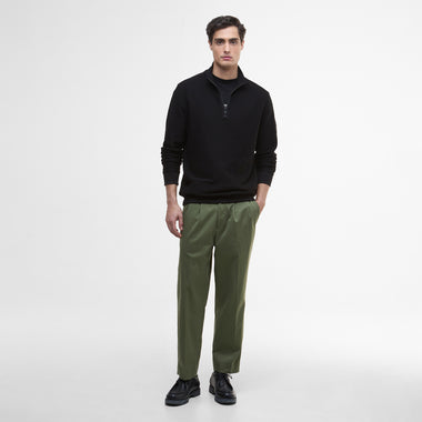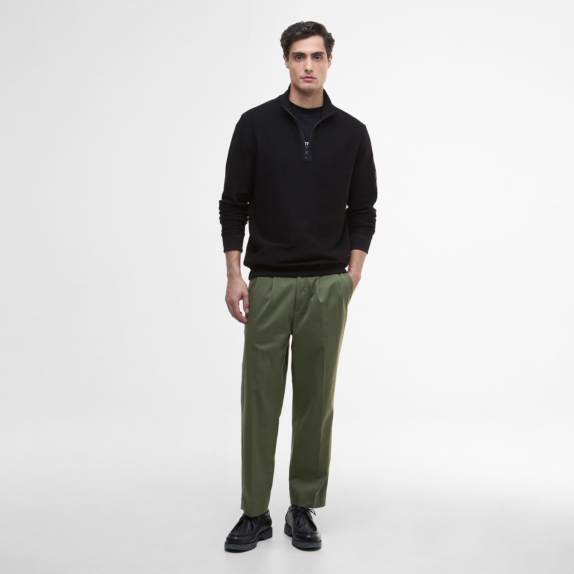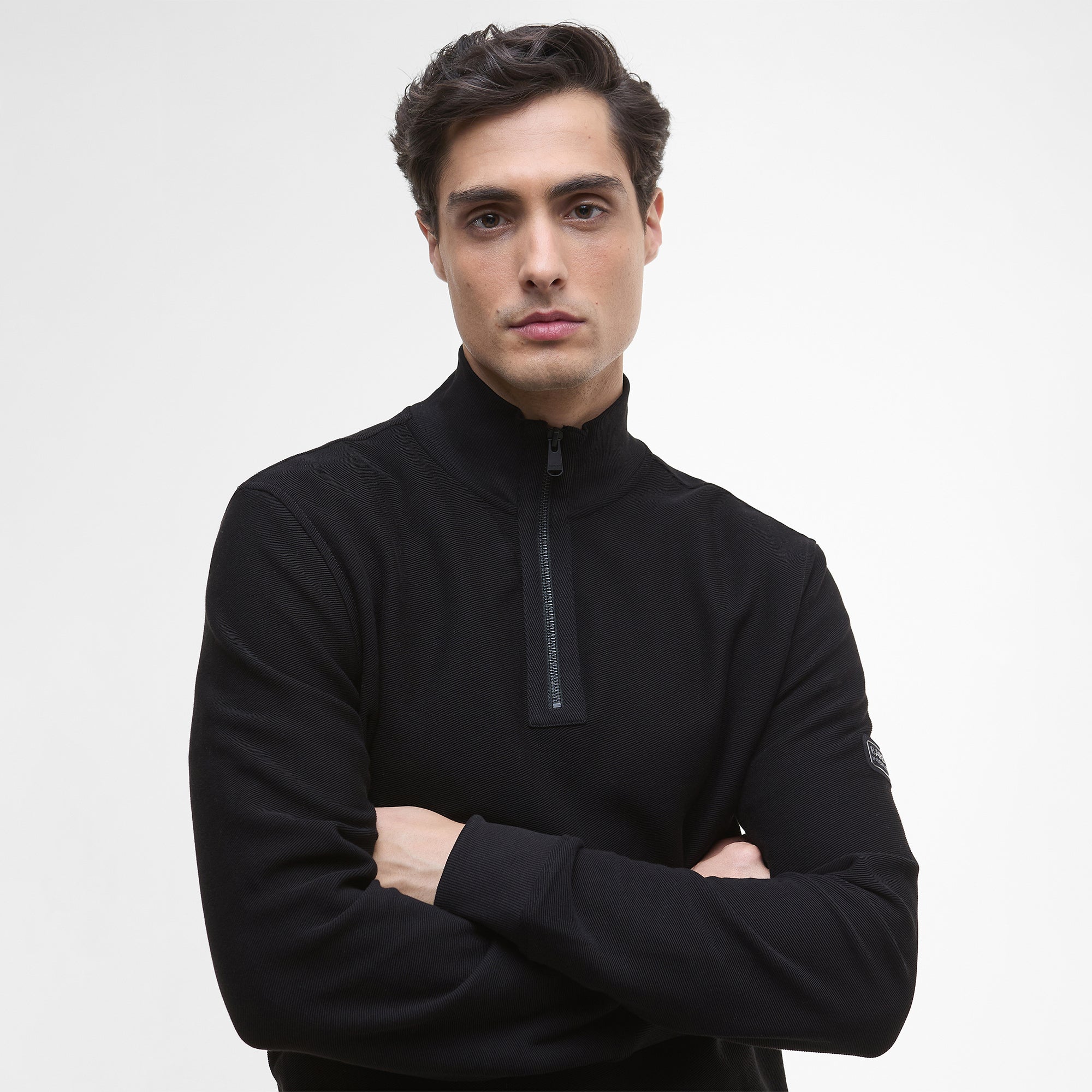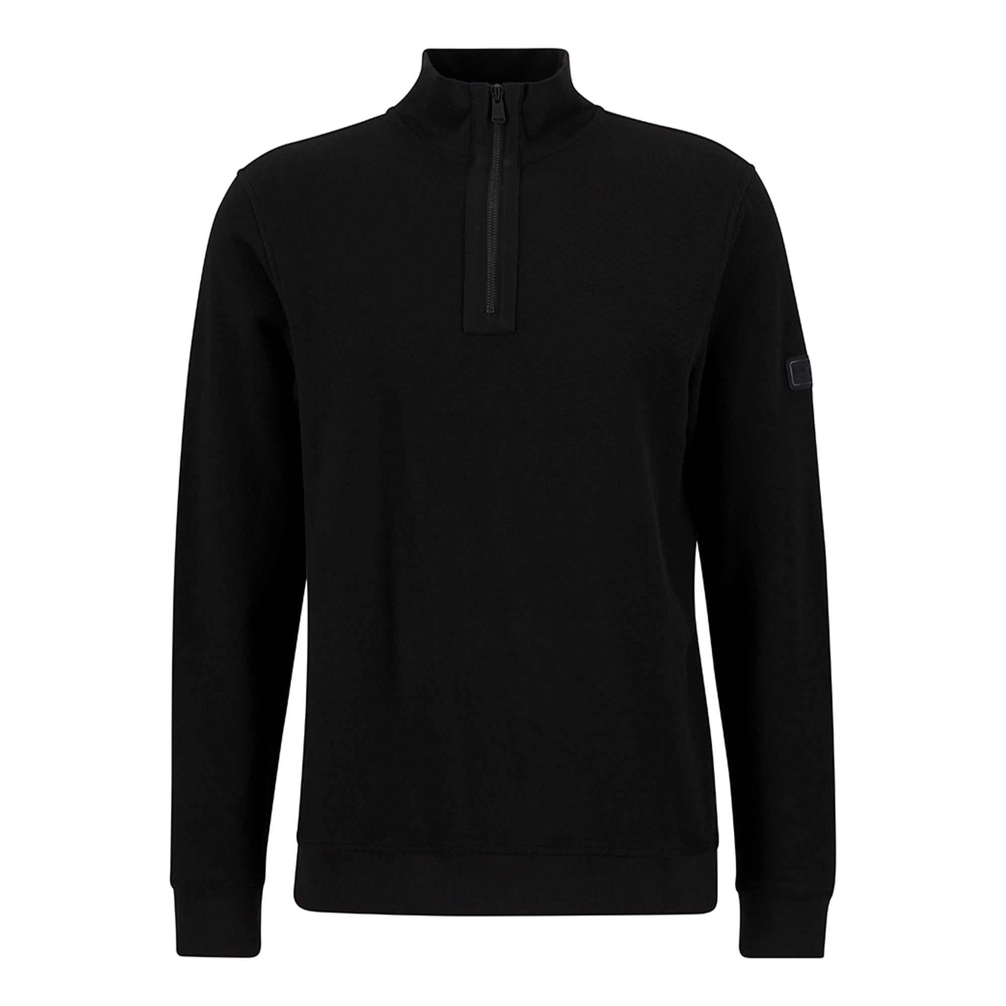 100% Cotton Twill knit funnel neck featuring a laid on twill placket with a metal zip. Finished with self fabric lower welt pocket and 1X1 rib knit hem and cuffs.
