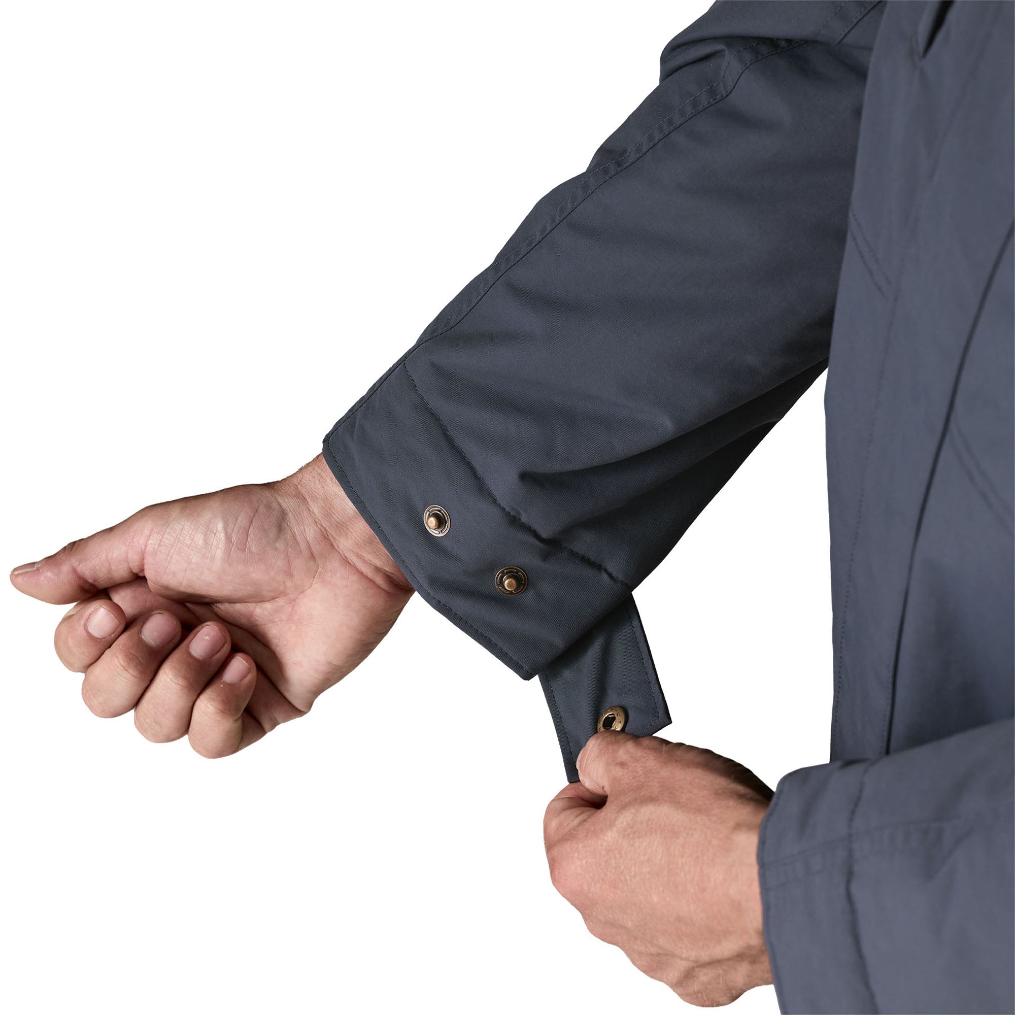 Adjustable cuffs have snap-tab closures