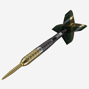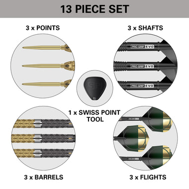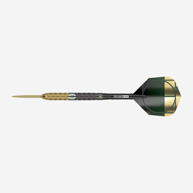 The Elysian-inspired grip features a distinctive black and gold performance coating containing a number of cells throughout for a strong yet subtle grip texture. The stunning engineered barrels flow into the high performance Pro Grip EVO shafts finished with flights that feature accents of deep green for a truly special look for a complete dart inspired by a luxury lifestyle aesthetic. The straight barrels are completed with gold Swiss Points, Target's patented interchangeable points for a truly customisable dart.