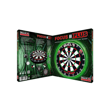 The Focus II Plus is the beginning of a new dartboard era. This board is the best BULL'S dartboard ever. For more than 30 years, BULL'S has stood for innovation and quality and has hereby reached its current peak. Every component of the Focus II Plus has been meticulously planned, designed and fused together to create this unique dartboard. High end dartboard technology in a stunning design. The centrepiece is the outstanding African sisal. Durable and up to the highest demands. The innovative sisal processing creates an amazingly high-contrast and high-quality target area. This new sisal processing also makes it easier for the darts to penetrate the board and stabilizes the darts in the board. This procedure enables the spider to be embedded very deeply in the sisal, so bounces (rebounds) are almost impossible. The hitting surface is optimized thanks to the deeply embedded, extra-thin spider, which is particularly evident in the area of the BULL'S Eye compared to conventional dartboards. The Spider-Leg-Free method used means that no metal brackets are visible around the hitting area. This significantly increases the overall impression of the dartboard. The sharp, high-quality imprint and the modern metal numbers complete the outstanding overall impression of the Focus II Plus. The metal numbers are on a rotatable and powder-coated number ring, which avoids reflections. The Focus II Plus has exact tournament dimensions (45.5 x 3.8 cm) and thus corresponds to international tournament regulations. A user manual and a board wall mount are included.