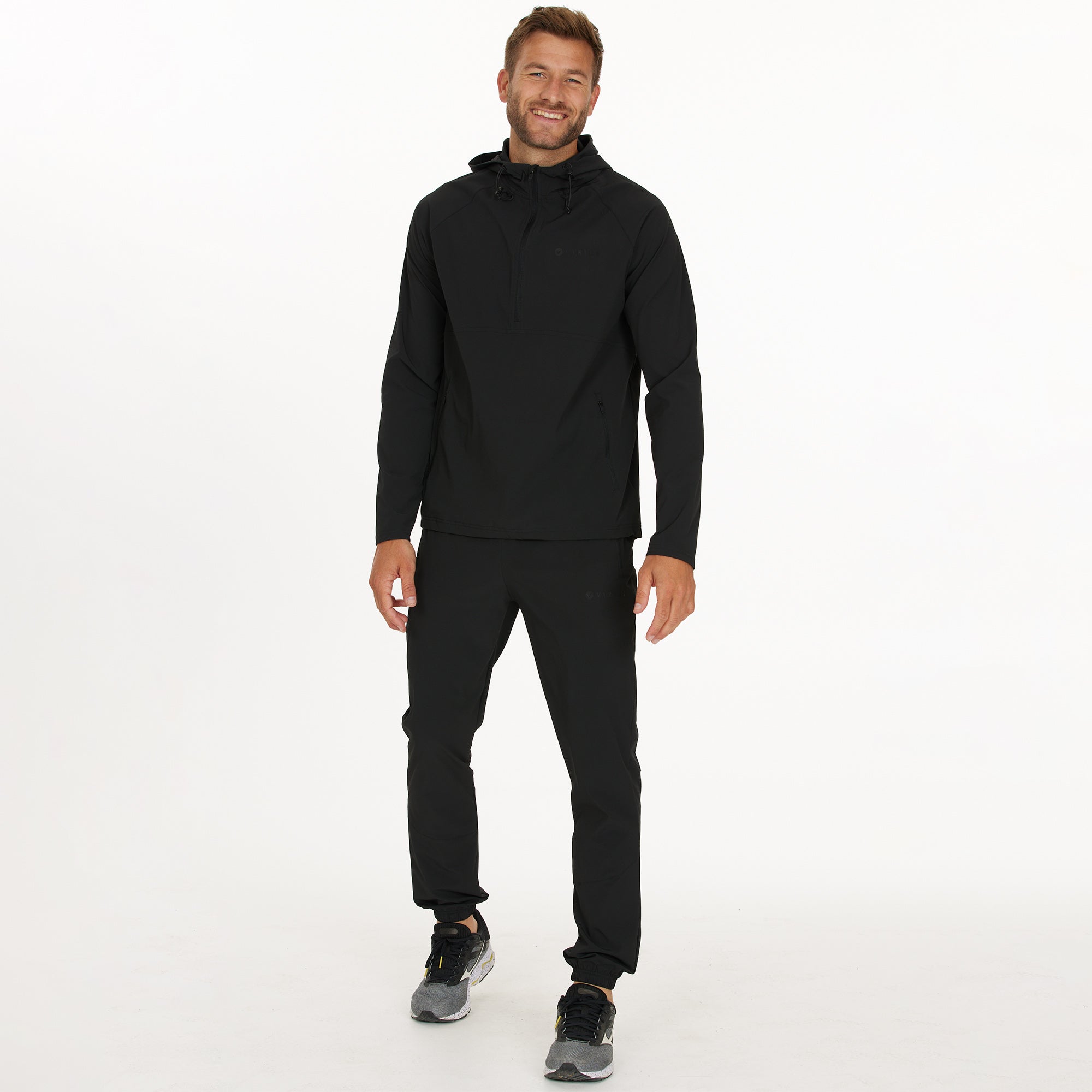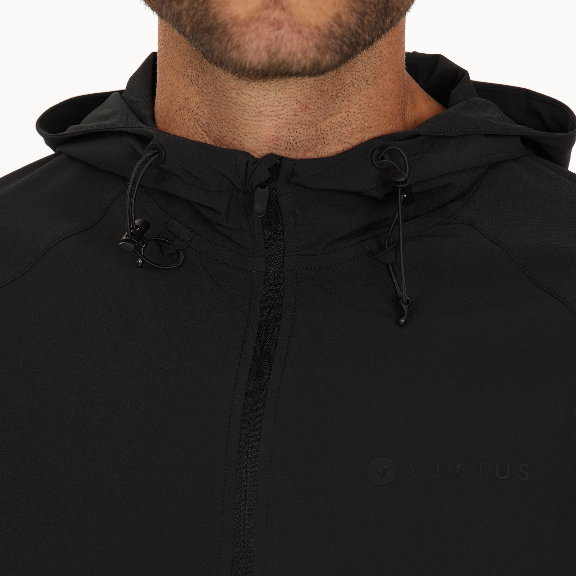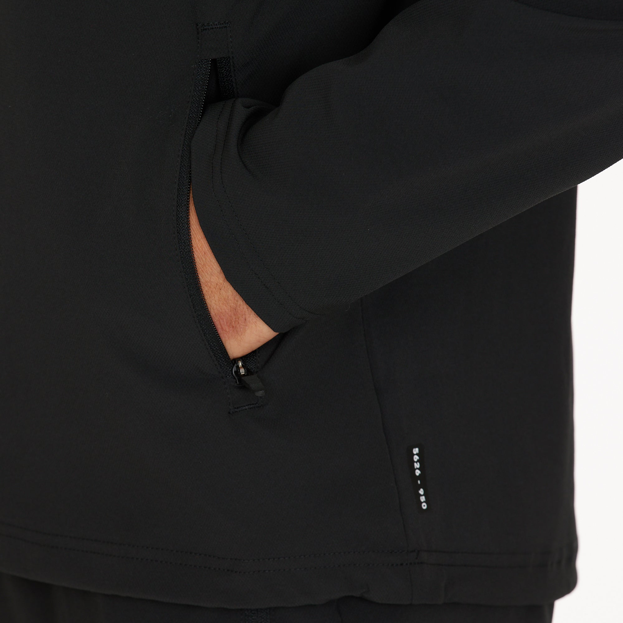Technical details Perfect for walking, running, and other active pursuits, this jacket is made from 90% polyester and 10% elastane. Key features include side hand pockets, durable water-repellent (DWR) treatment, an adjustable hood, a half front zip, breathability, and stretch for comfort. Designed with a regular fit.