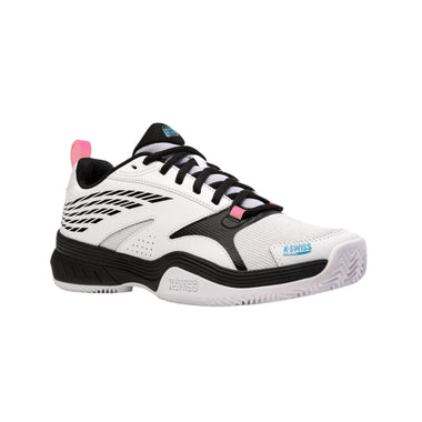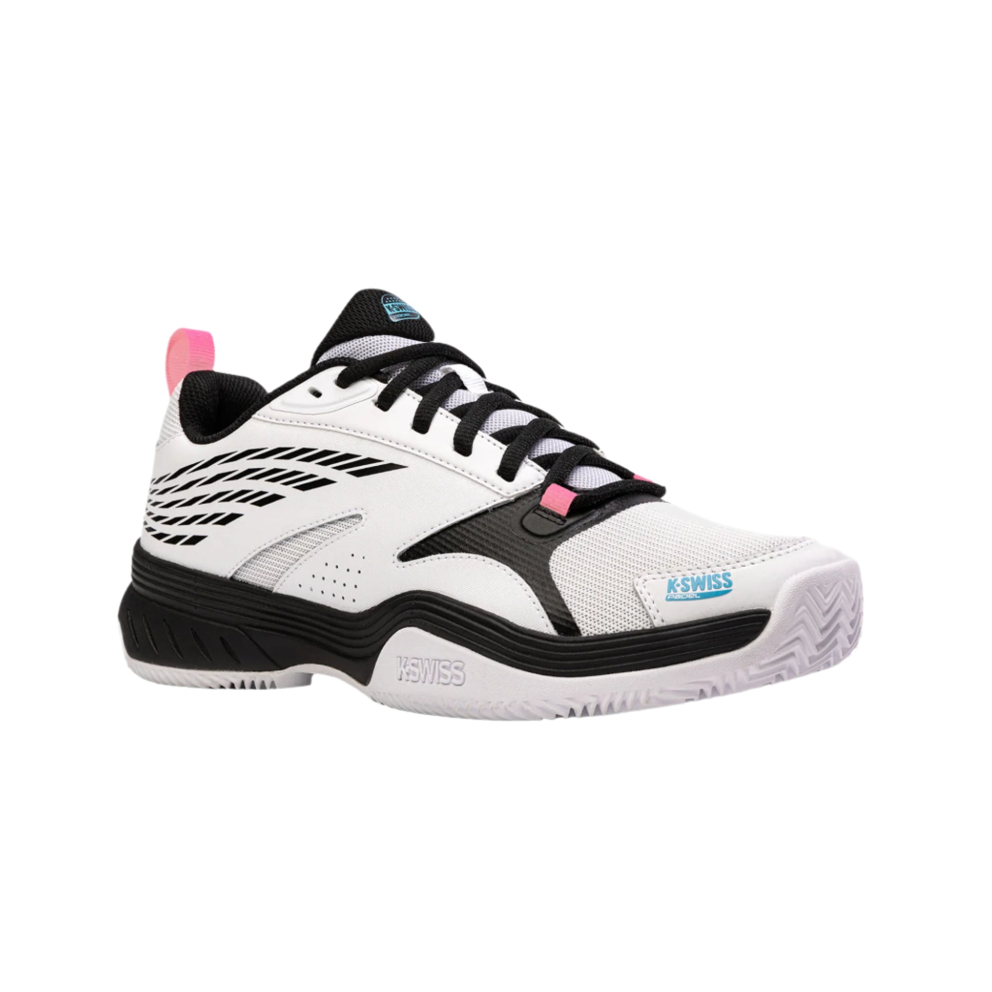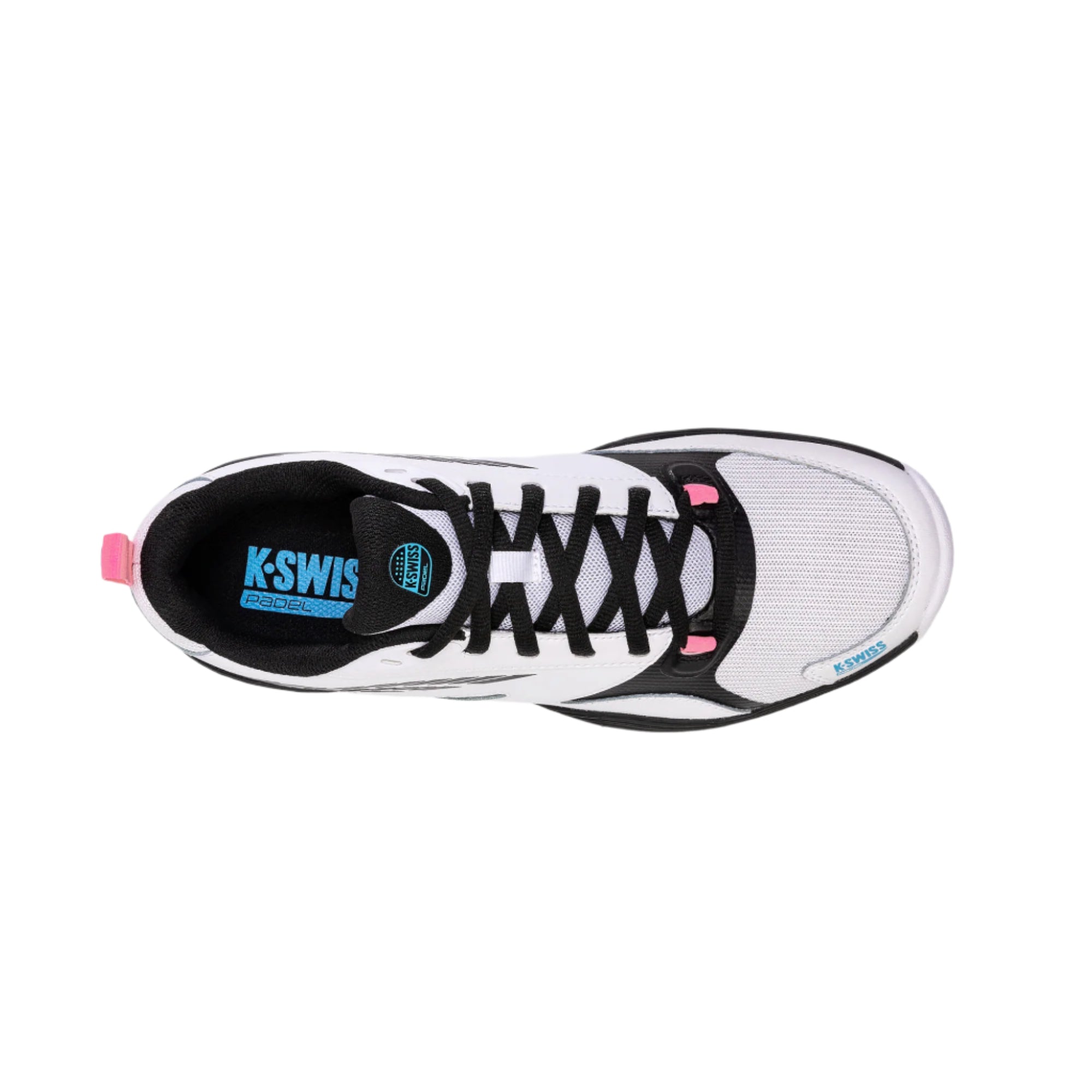 Its breathable mesh upper is reinforced with hot melt TPU film and synthetic leather combination panels for lightweight protection and support. A compression-moulded K-EVEA midsole gives a cushioned ride, while the Aosta 7.0 rubber outsole with a herringbone pattern provides superior traction on various Padel court surfaces.