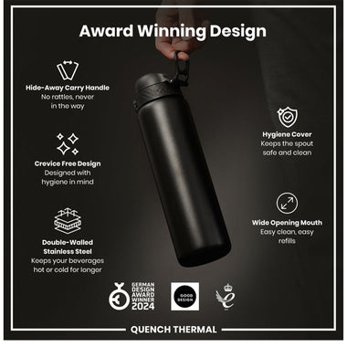 Made from vacuum insulated pro grade ThermoShield stainless steel. Stainless steel is extremely durable, lasts for years, and is carbon neutral and fully recyclable. This refillable and reusable drinks bottle is food safe, odour resistant, easy to hand wash, protects temperature for hours and keeps drinks fresh and full of flavour.