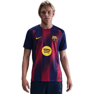 FC Barcelona's 2025/26 home jersey updates one of the most recognizable looks in soccer. Their iconic Blaugrana is fused with movement-inspired graphics and bright, energetic accents to celebrate their fans' unity and devotion to the club.