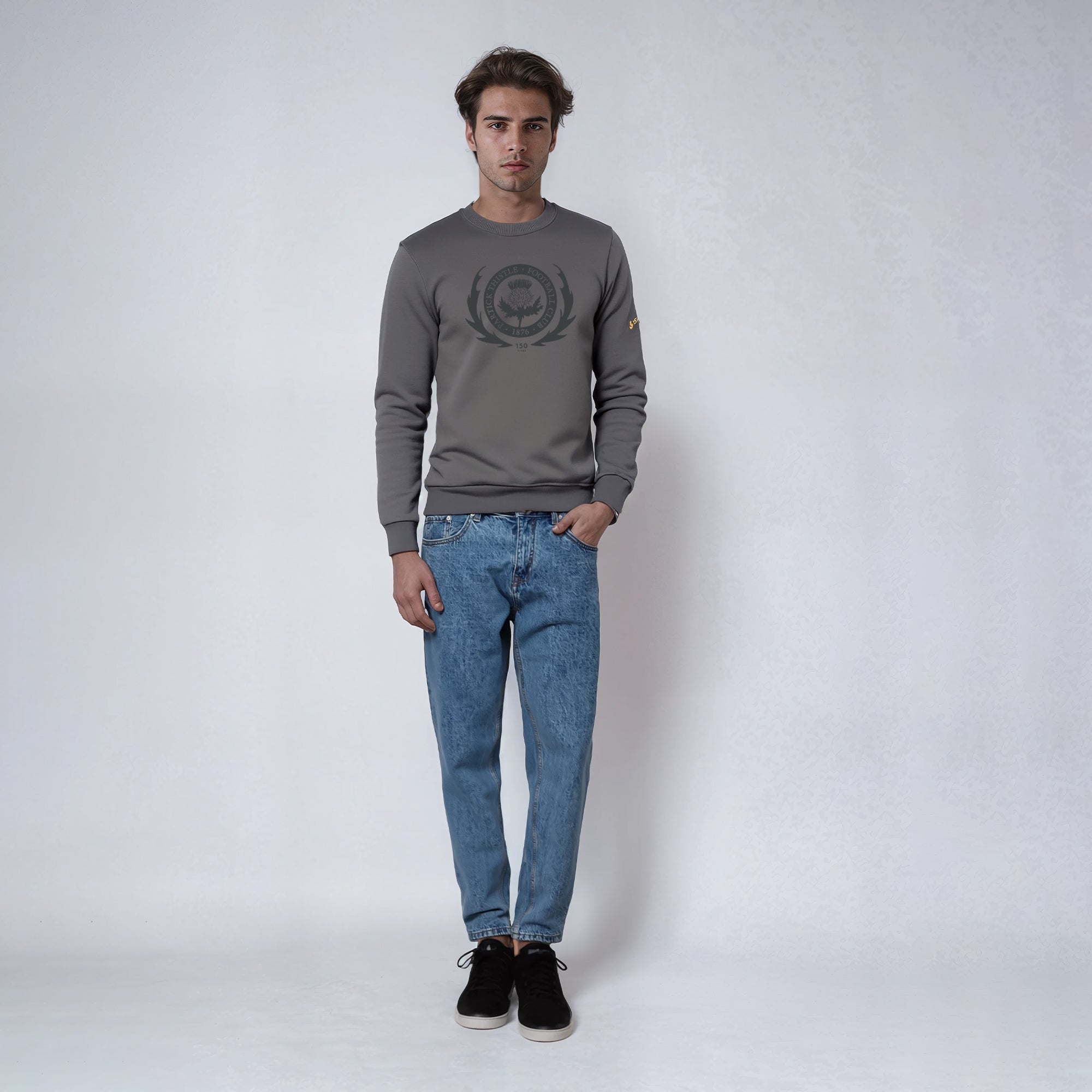 Crafted in a comfortable grey fabric, it features a striking printed anniversary crest on the front and a gold embroidered anniversary year on the sleeve, blending style with heritage.