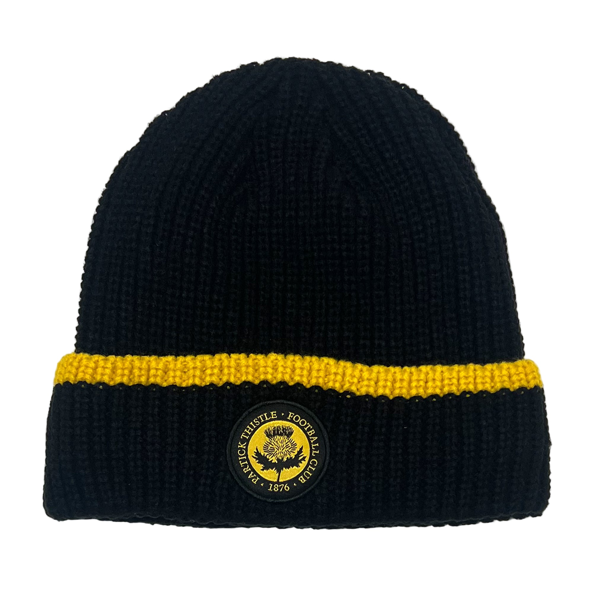 Stay warm and show your colours with this classic ribbed knit beanie featuring Partick Thistle branding.
