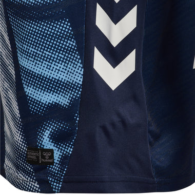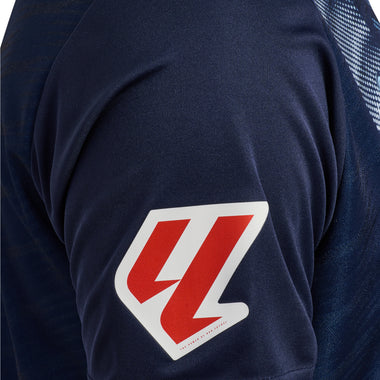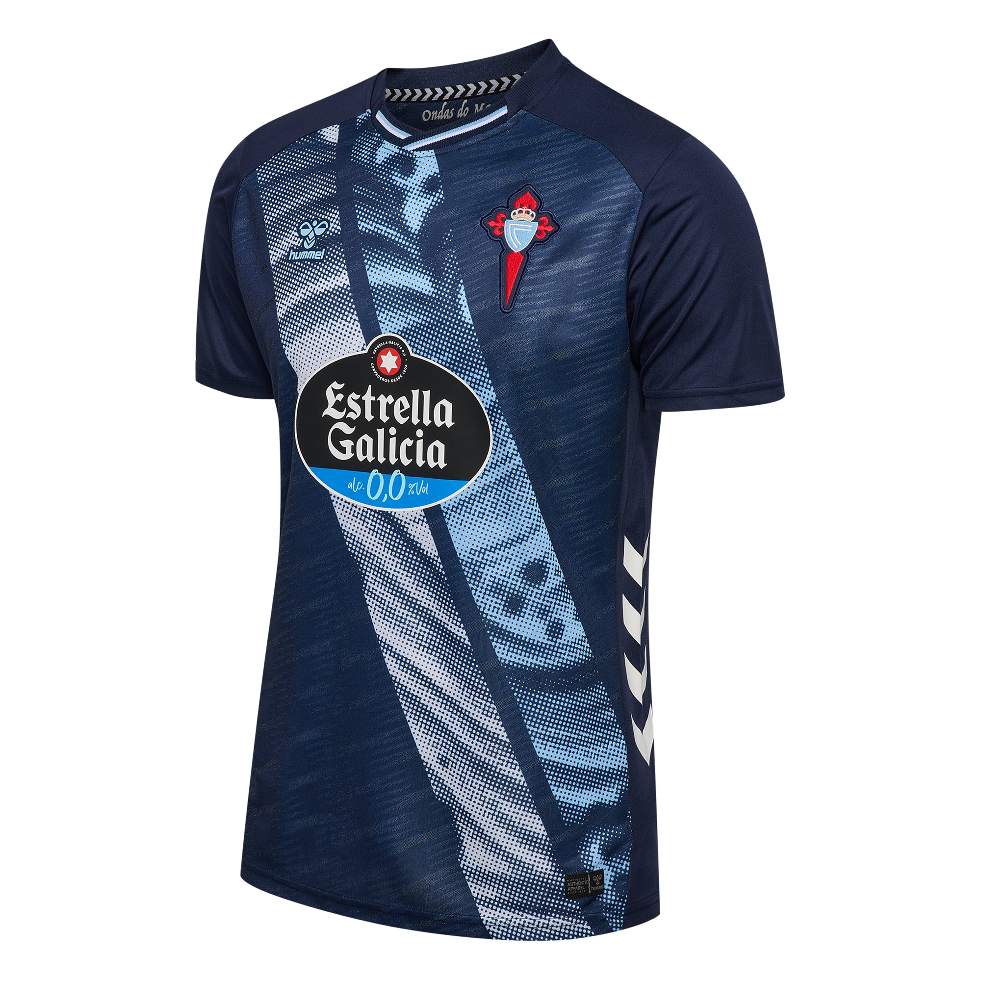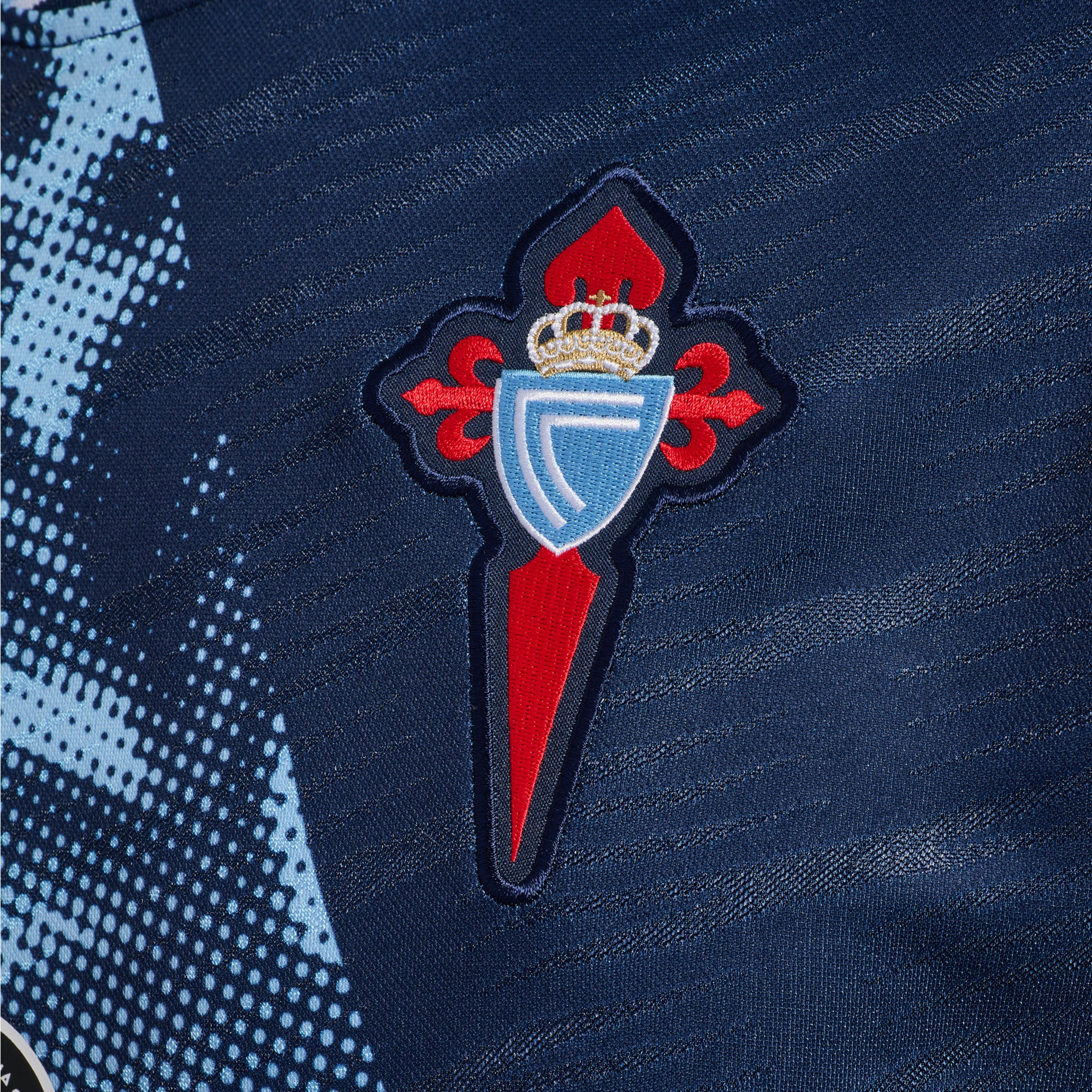 The official Celta Vigo 25/26 away jersey comes in a deep navy base with eye-catching white and light blue diagonal stripes across the front. Designed to combine tradition and performance, the shirt features a contrast ribbed crew neck, woven club badge, and a special jacquard knit with matte/shiny effect. A Celtic-inspired neck print pays tribute to the club's cultural heritage, while hummel’s Beecool technology ensures breathability and quick drying – ready for matchday.