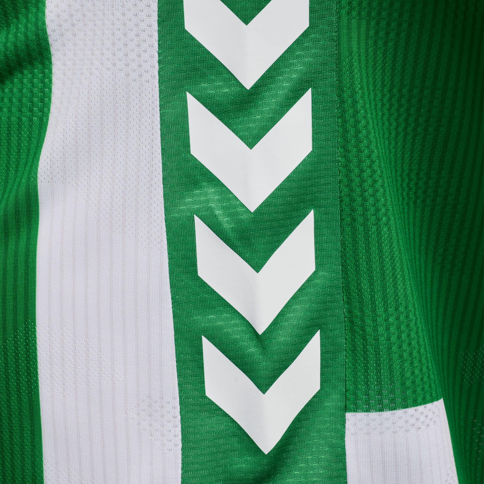 Presenting the Real Betis 2025/26 home shirt by hummel, featuring notable updates from earlier versions. The green hue takes on a more prominent role, particularly on the back, while the front displays the classic green and white vertical stripes, now broader than in previous seasons.