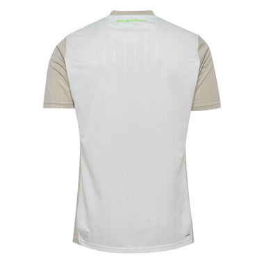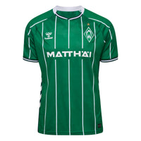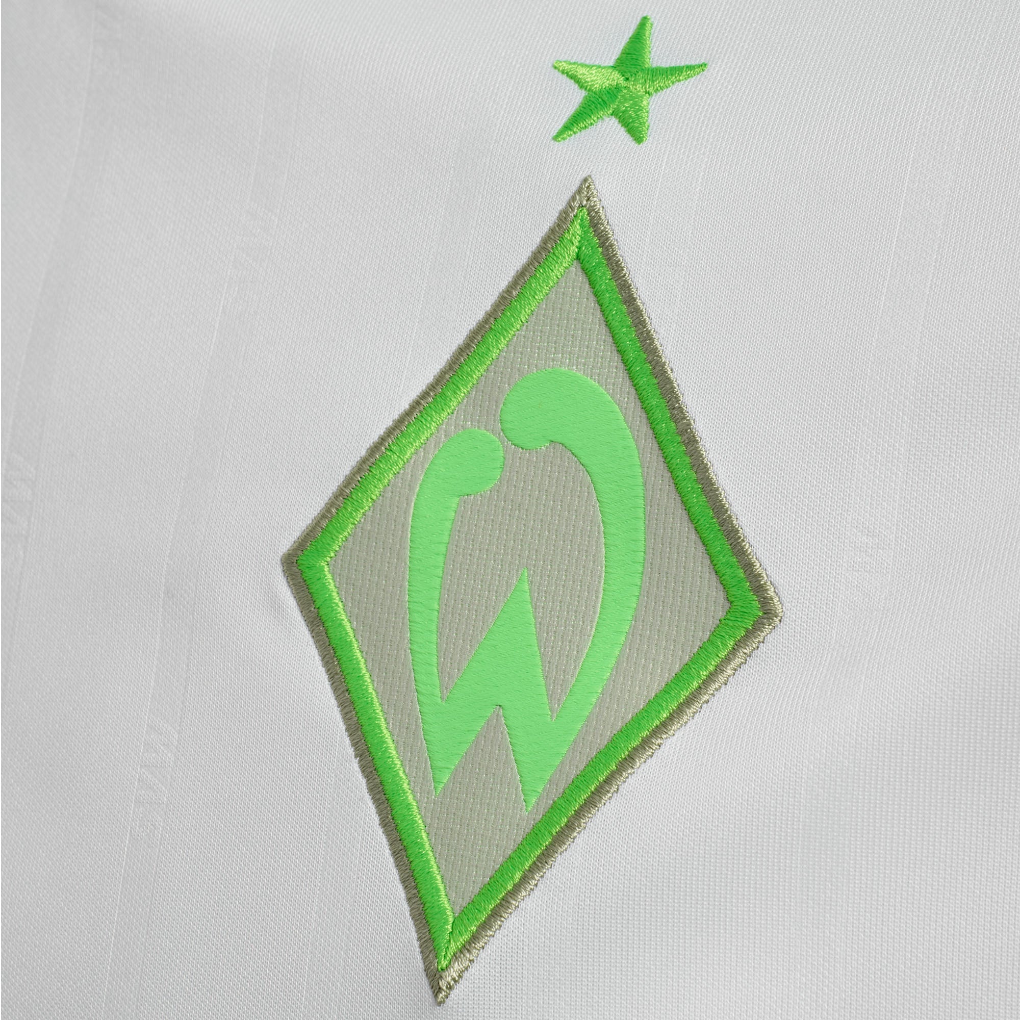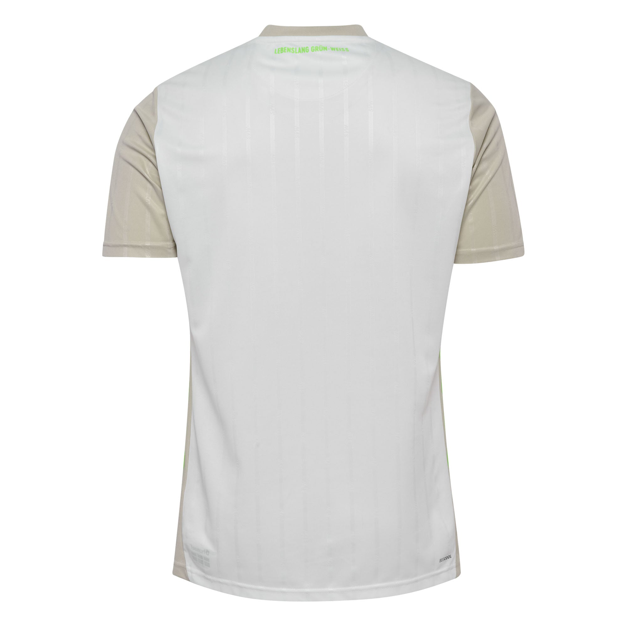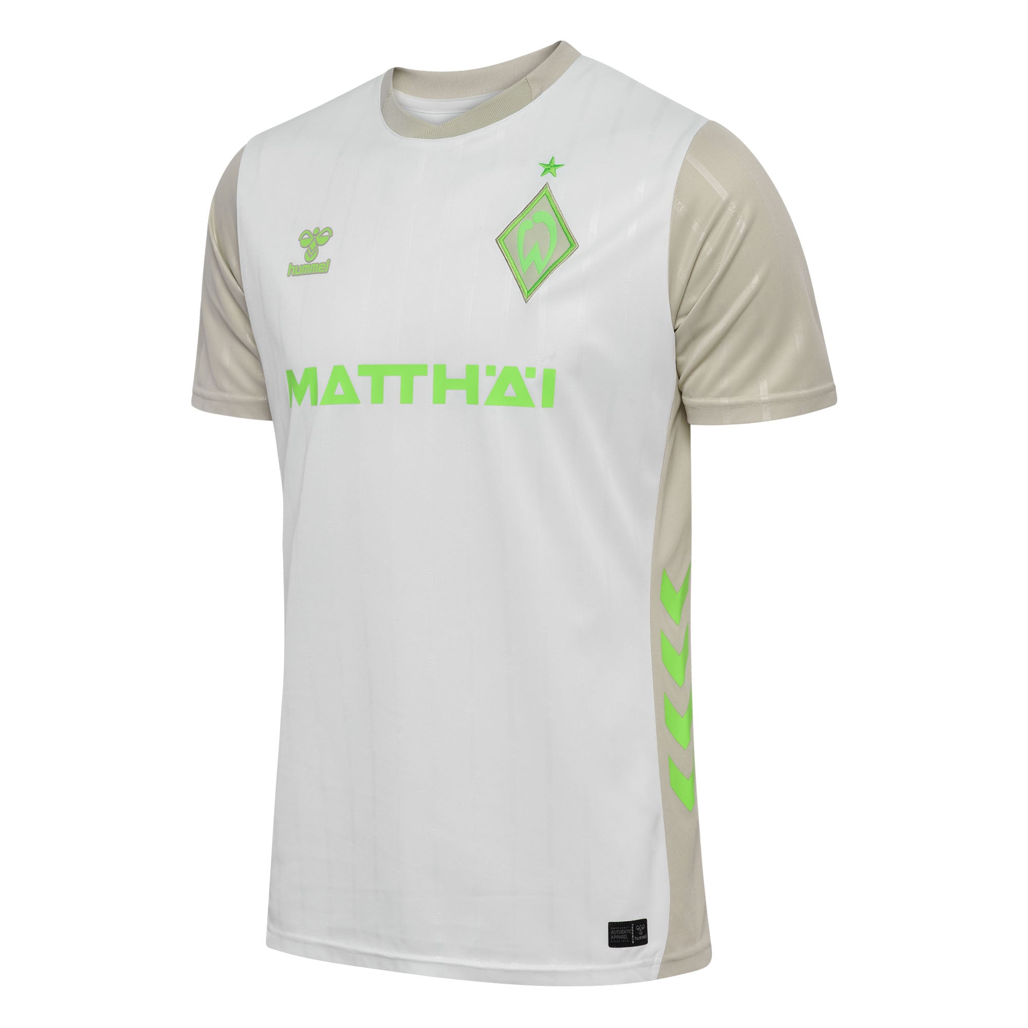 Inspired by the neon lights seen on away trips, this jersey features vibrant neon green accents on the logos, “Lebenslang Grün-Weiß” lettering on the back, and the iconic hummel angles along the sides. Set against a clean white and beige backdrop with subtle pinstripes showcasing a tonal “SVW” design, it combines style with tradition.