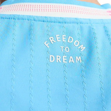 Broken only by waves of subtle pinstripes and pops of pink, the ocean-blue colours of this third shirt bring a calming elegance. Heat-applied onto the lightweight fabric, a club badge and adidas Trefoil add extra appeal. Moisture-managing AEROREADY and a performance-focused build make for flowing football on the pitch.