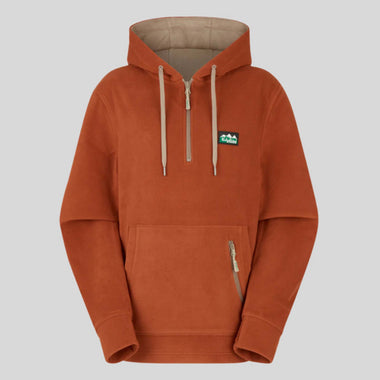 Lightweight, warm and highly breathable, it features a a 1/4 zip front and a large, double-thickness hood — thick “boot lace” ties cinch it in for extra cosiness.