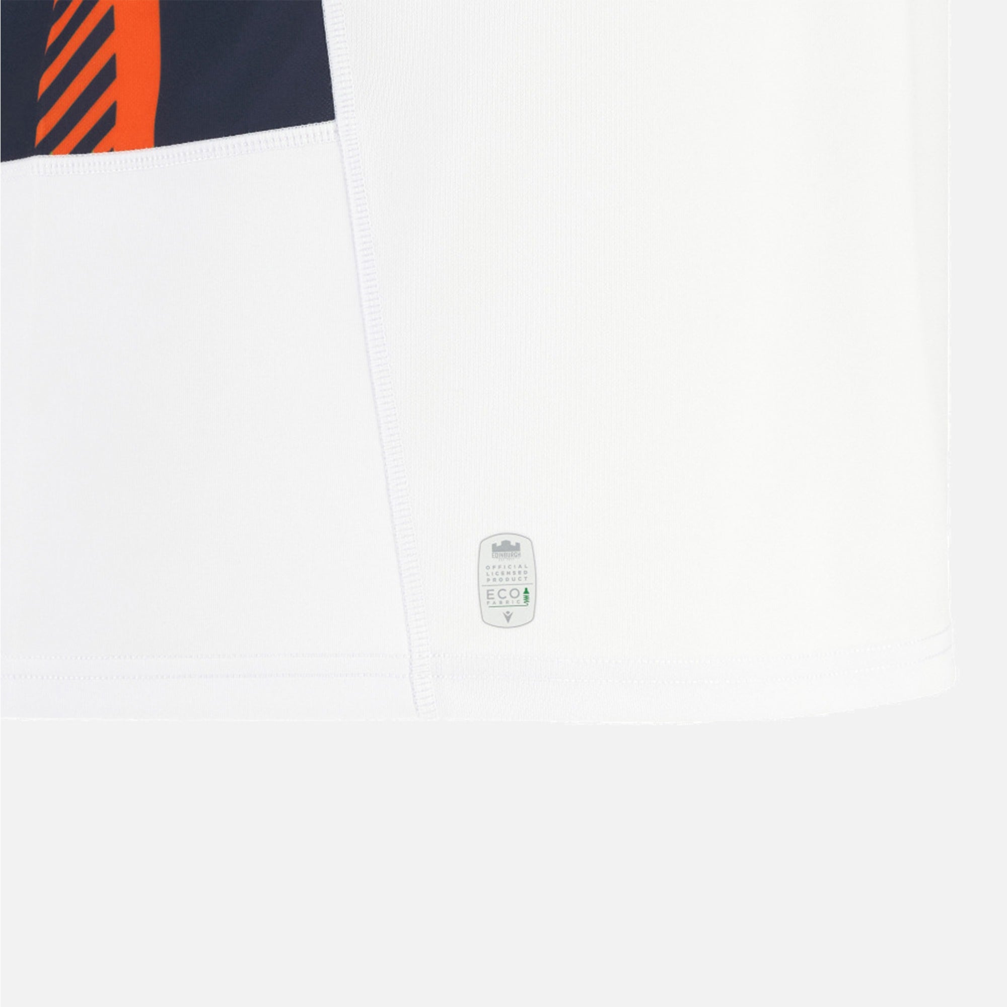 2025/26 away replica shirt - white relaxed fit shirt with Edinburgh Rugby tartan panels on the flanks, navy v-neck fold over collar with orange details, ER tartan details on the cuffs and Edinburgh Rugby crest embroidered over the heart.