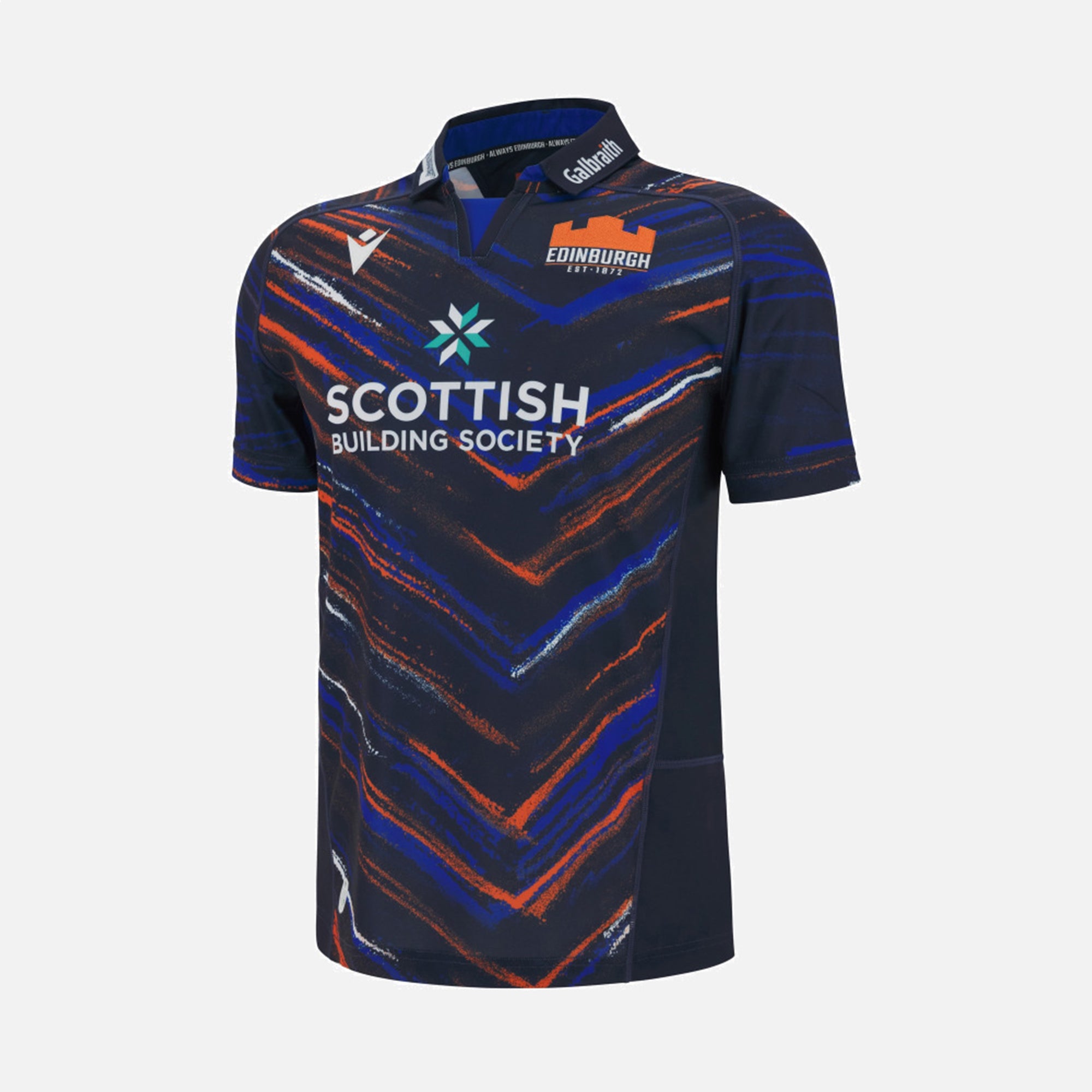Edinburgh Rugby 2025/26 Junior Home Replica Shirt. 2025/26 home replica shirt - Navy relaxed fit shirt with white, orange and blue chevron pattern, v-neck fold over collar with club crest placed over the heart.