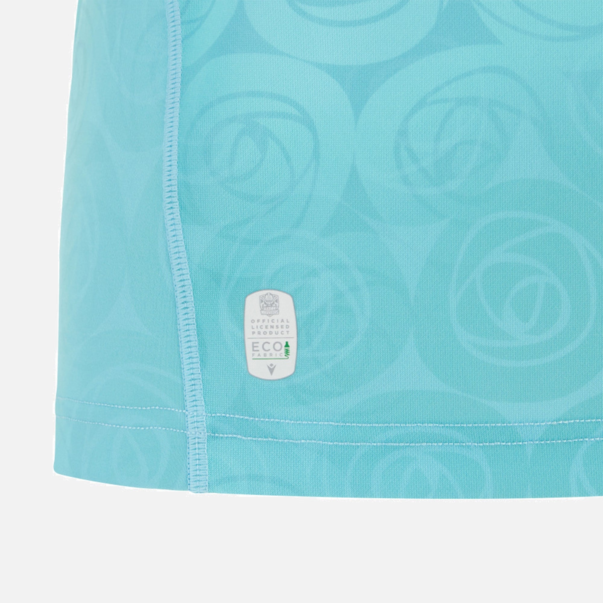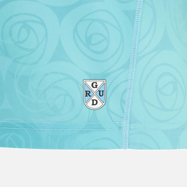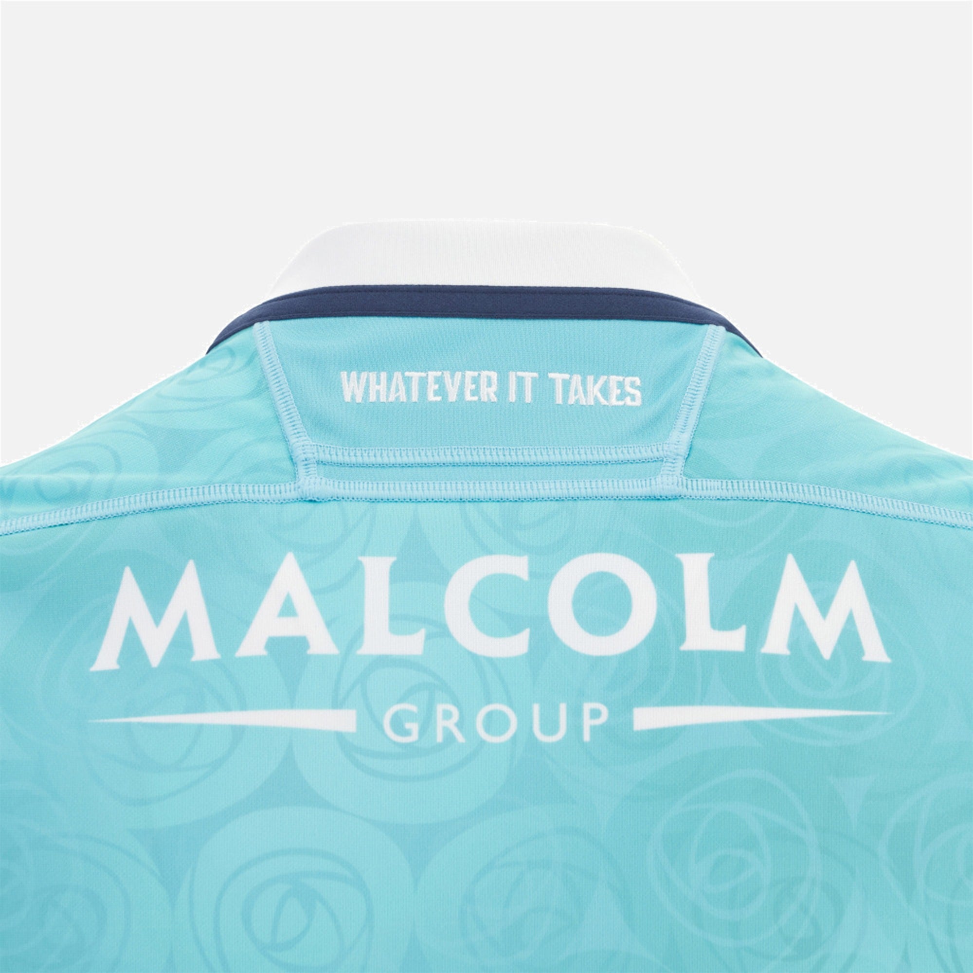 2025/26 away replica shirt - Teal and sky blue, relaxed fit shirt with white and navy korean style collar, Mackintosh style rose pattern over the body and Glasgow Warriors crest over the heart.
