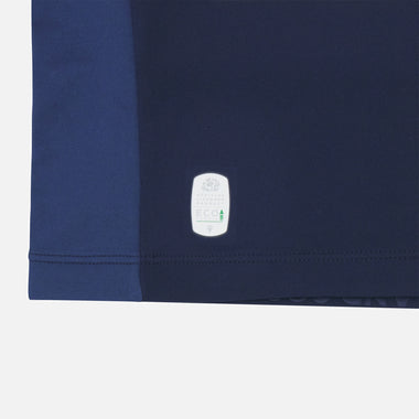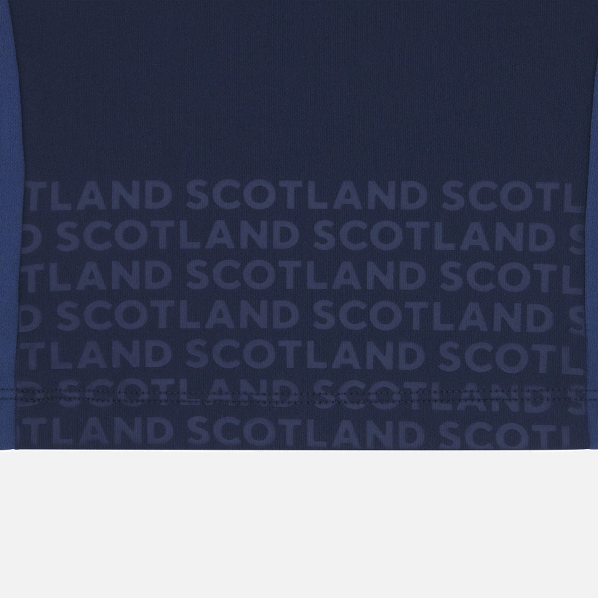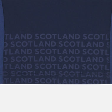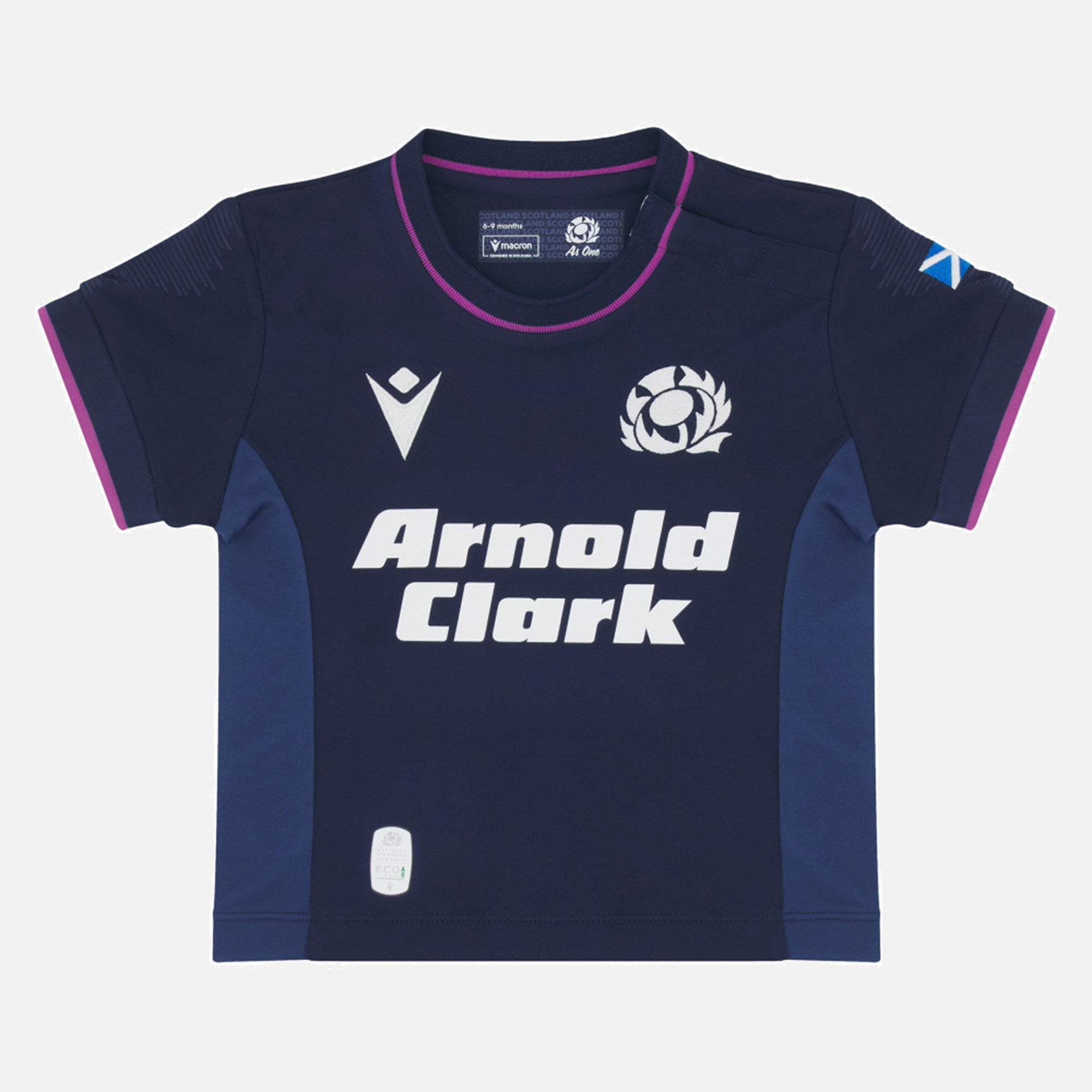 2025/26 home replica shirt - navy baby shirt with soundwave pattern over the shoulders, round collar with purple details and white Scotland crest embroidered over the heart.
