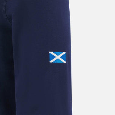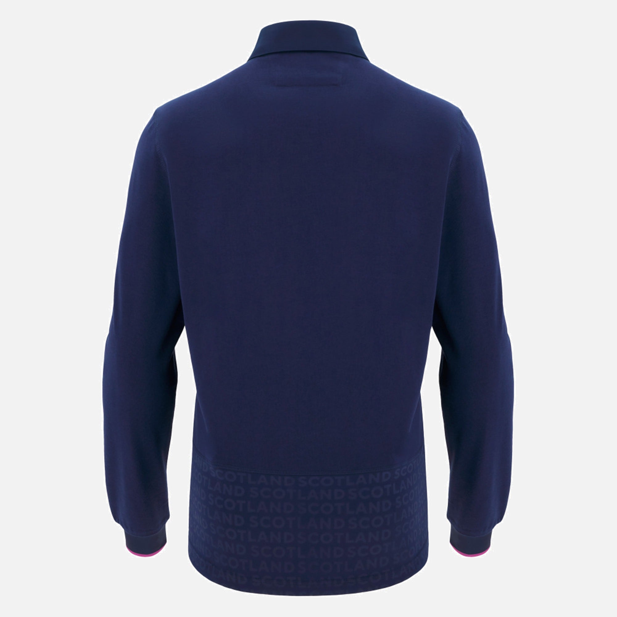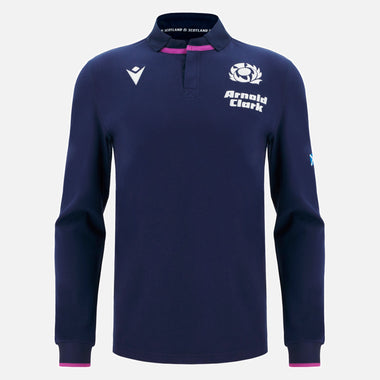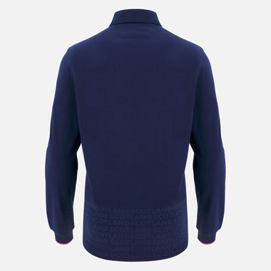 2025/26 home cotton shirt - navy relaxed fit, long sleeved shirt with traditional polo collar, purple details on the cuffs, soundwave pattern on the flanks and white Scotland crest embroidered over the heart.