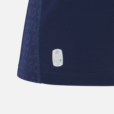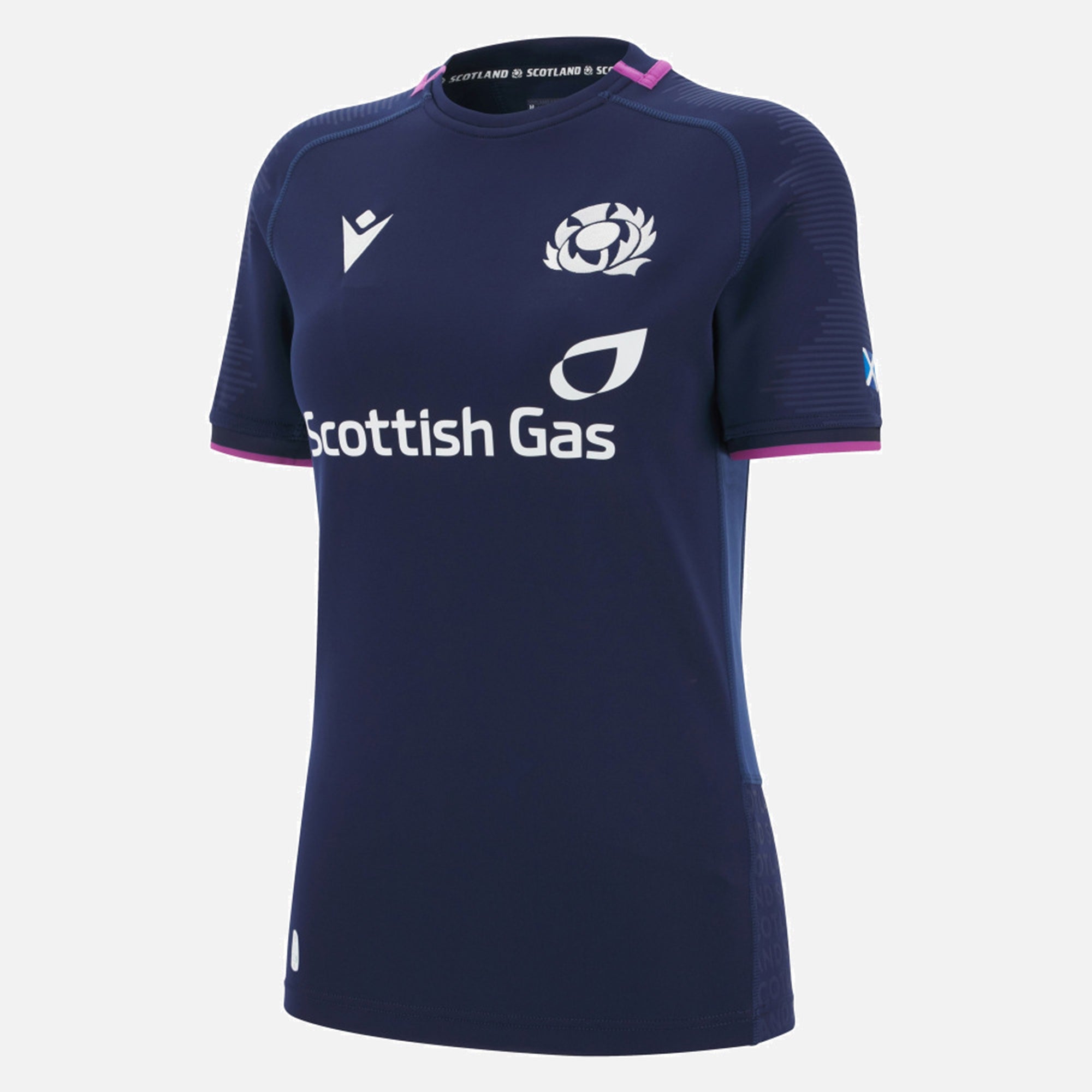 2025/26 home replica shirt (Scottish Gas Sponsorship) - navy womens fit shirt with embossed soundwave pattern over the shoulders, round collar with purple details and white Scotland crest embroidered over the heart.