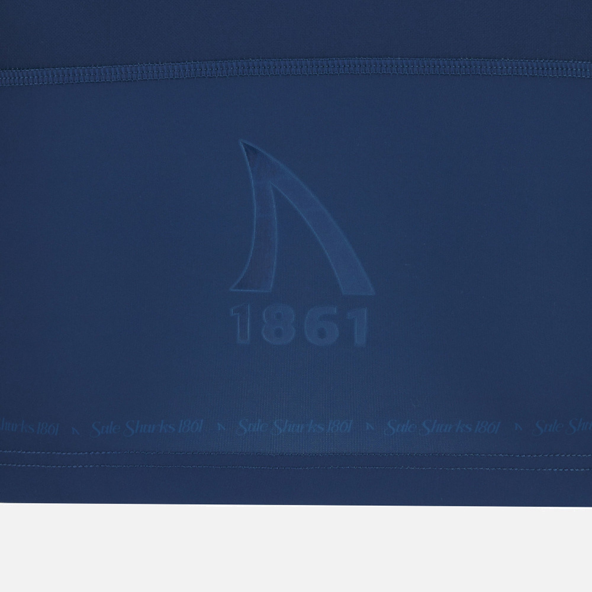 The Sale Sharks 2025/26 home replica shirt features a navy blue base with off-white details on the sleeve cuffs and collar, offering contrast and definition.