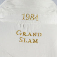 The Scotland Rugby Shirt 1984 Grand Slam. Manufactured from satin touch 100% cotton, the jersey features a detailed embroider Crest. Please note we use Ecru colour, rather than pure white to create a vintaged aged look to the garment. Other features include a herringbone finish on the vents and tape on the neck opening.Â