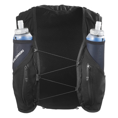 2 front flask pockets: Designed to fit Salomon soft flasks, these front pockets limit bouncing. Top elastic loops secure your flasks and keep them ready to drink.