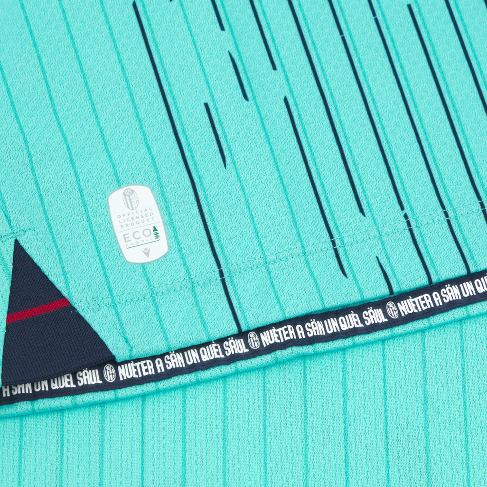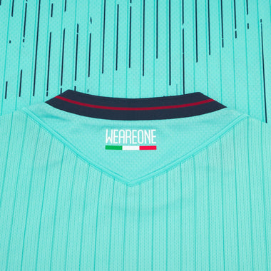 Inside the collar, a personalized tape features the phrase 'A SÅN UN QUÈL SÅUL', while the back proudly displays the 'WEAREONE' claim. A sustainable kit rich in identity, designed for those who live and breathe their passion for the rossoblù every day.