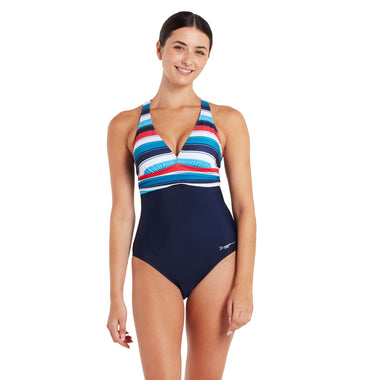 The Zoggs Seamarine Panel Crossback has a classic style front with a stylish back! This suit has a strappy crossover back and nautical striped fabric on the cups, making this suit a staple for every swimmers wardrobe. The v-neck front with wide straps and medium leg height creates a sleek and stylish silhouette, whilst the full foam cups and front lining offer support and coverage.