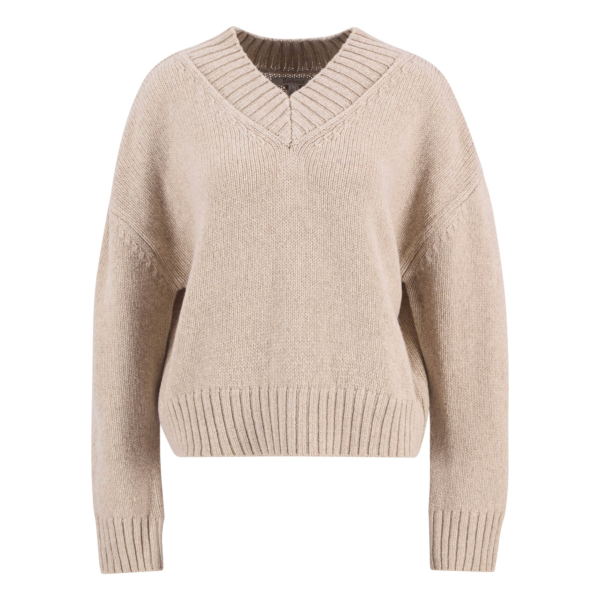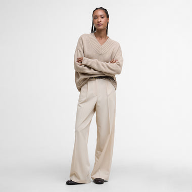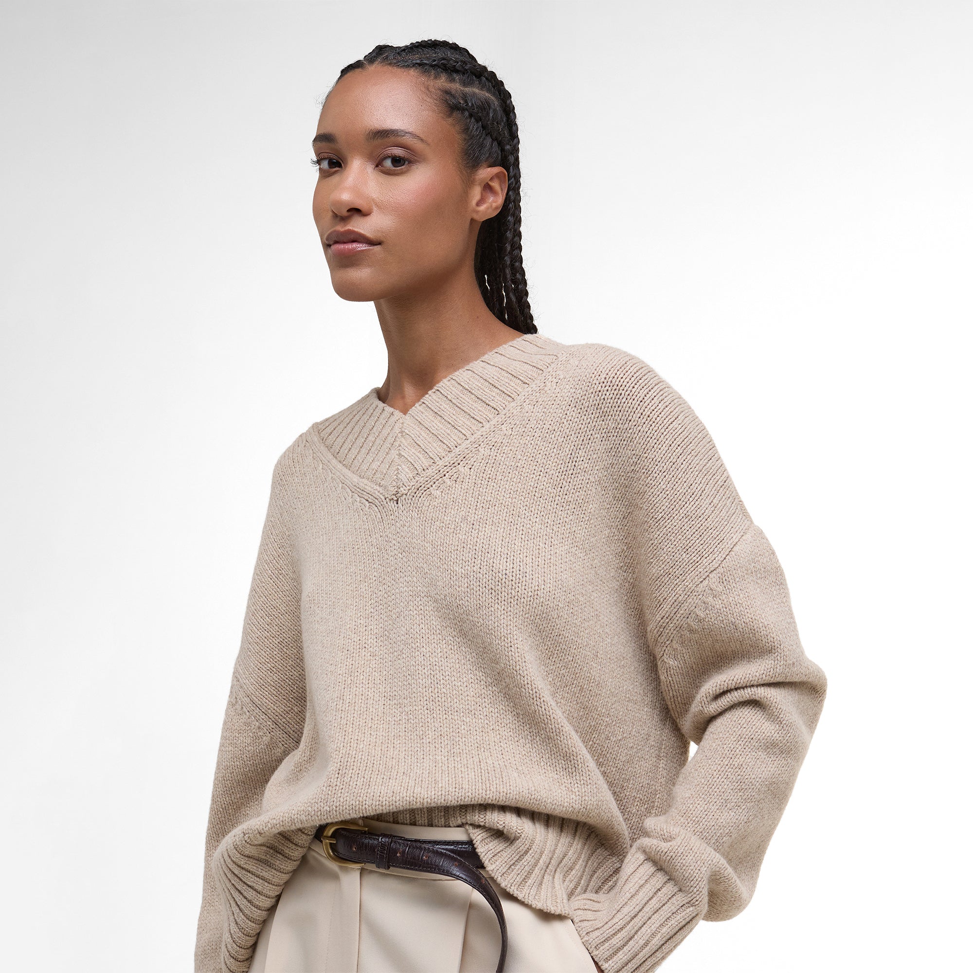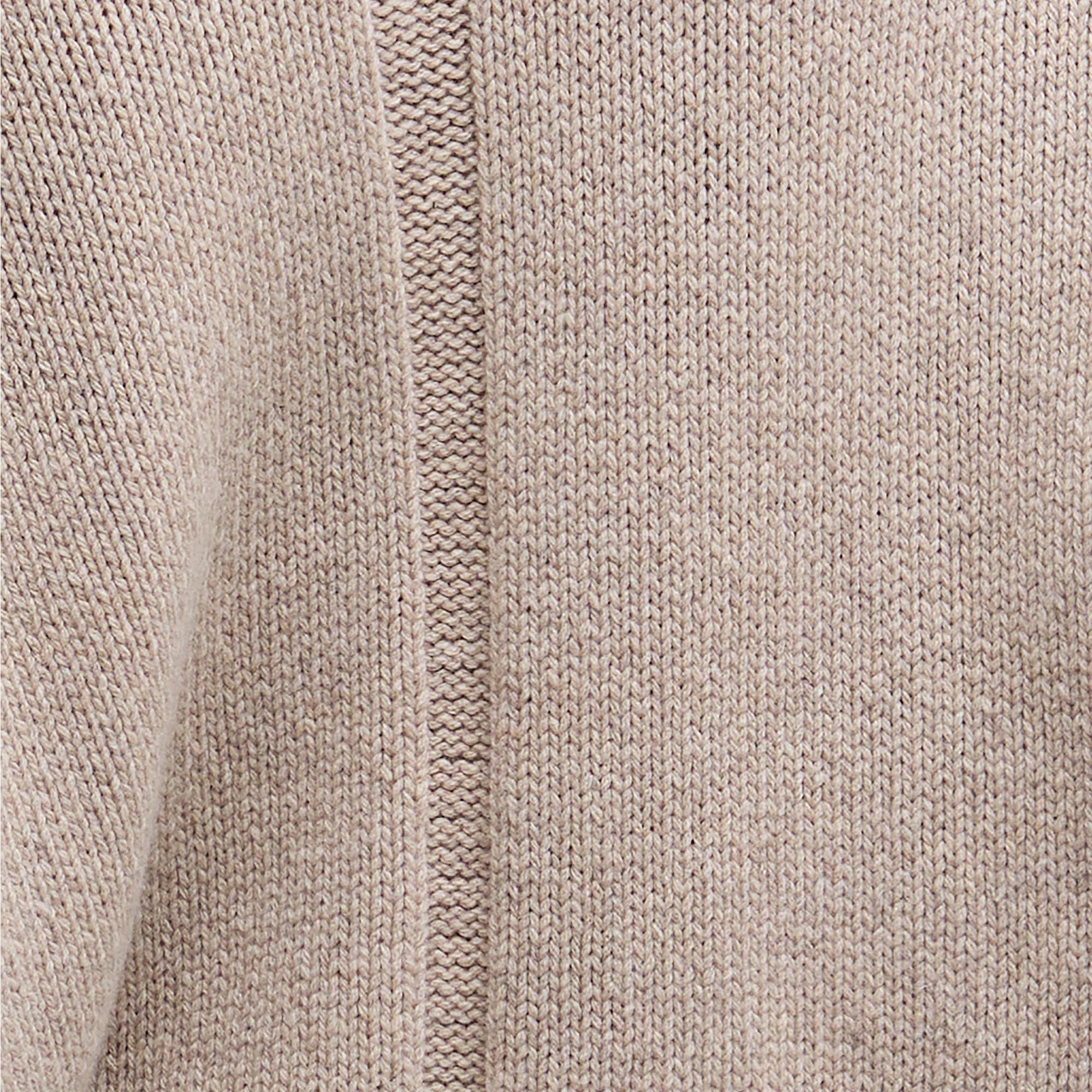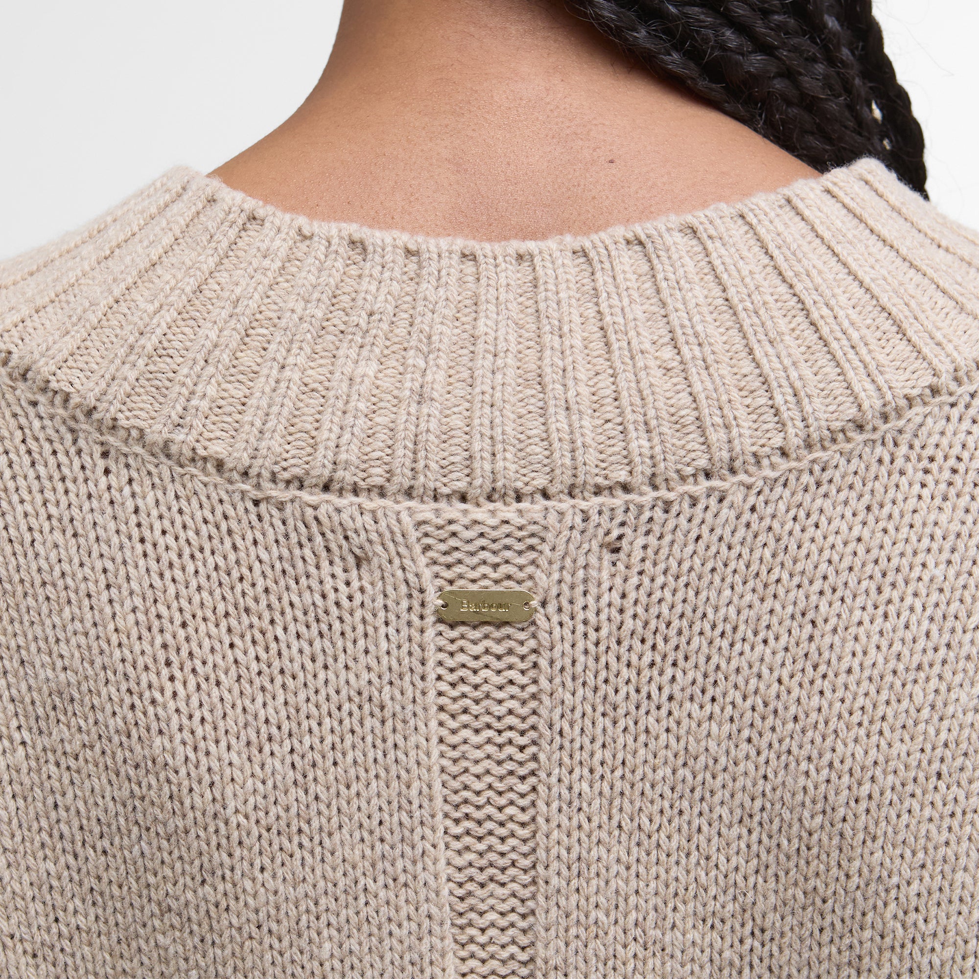 Heavy weight, roll neck knit with horizontal rib knit structure. Featuring dropped shoulder, wide sleeves with cuff split and contrast stripe detail to centre front.