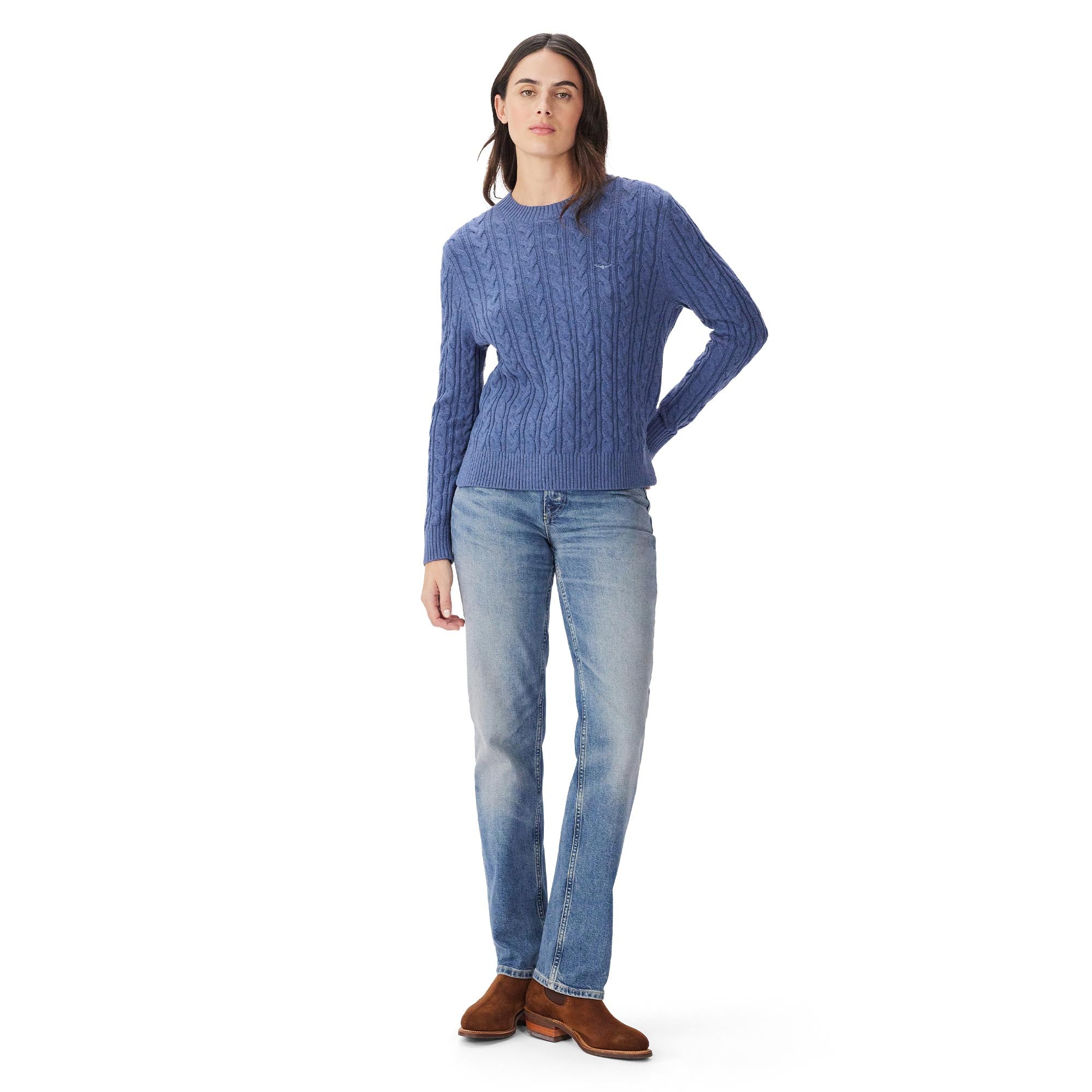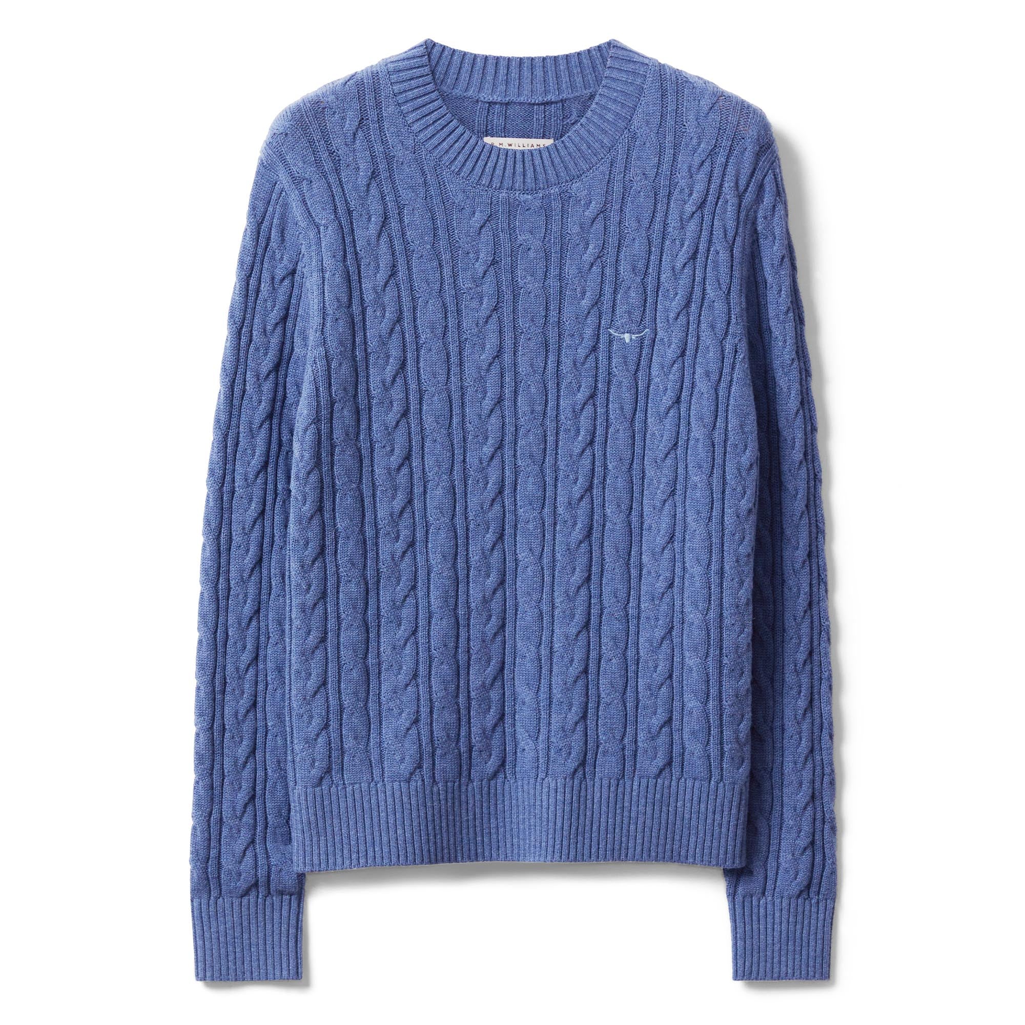A premium cable knit sweater, crafted from a blend of Australian Merino wool and cotton. This style has a ribbed crew neck, full-length sleeves, and signature Longhorn embroidery.