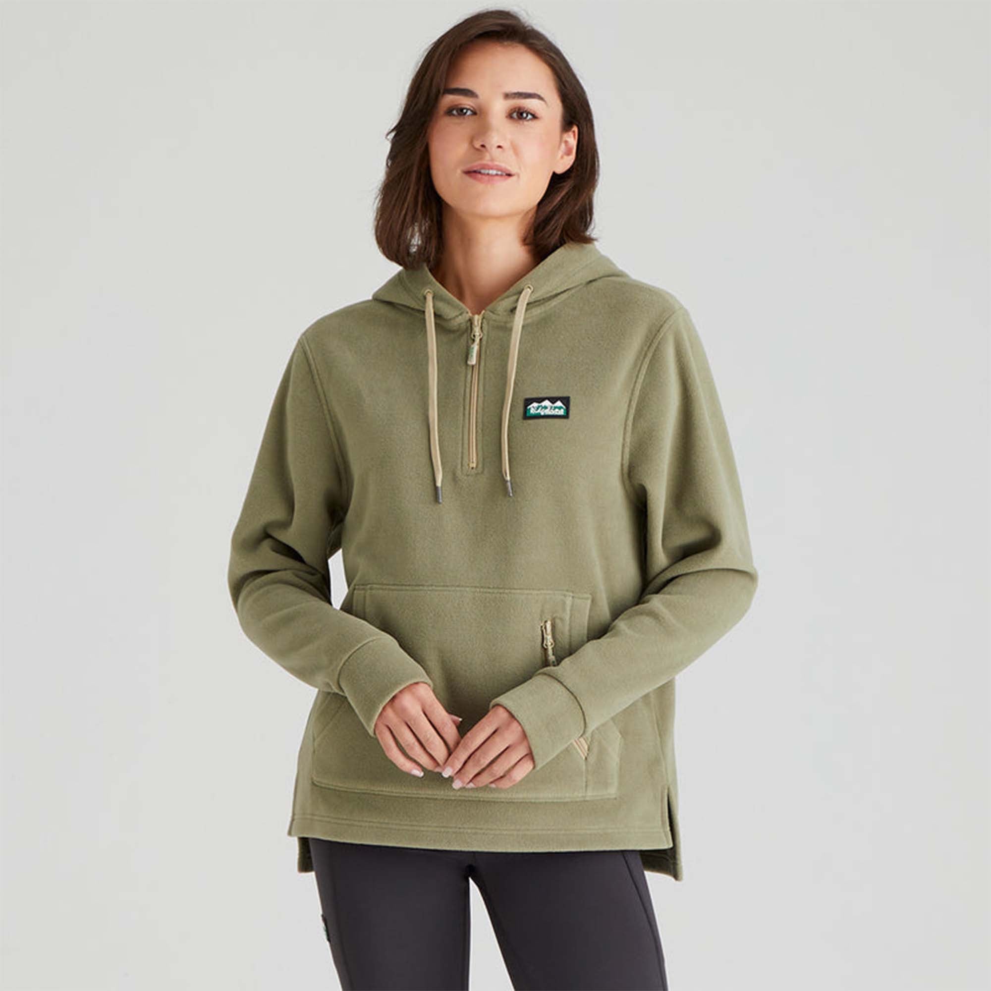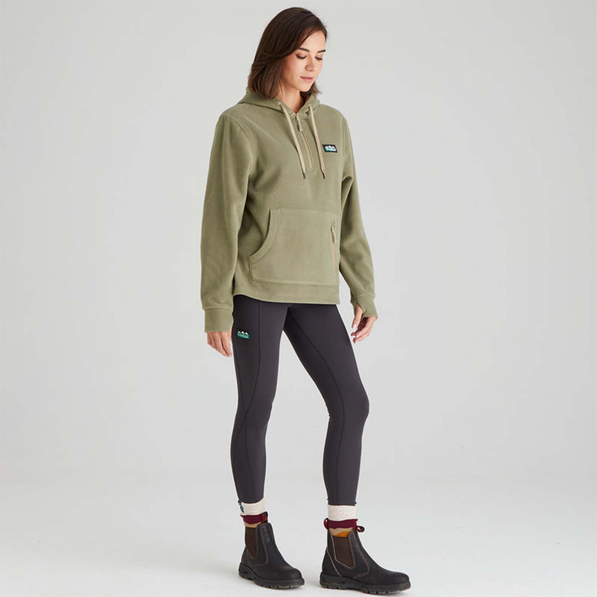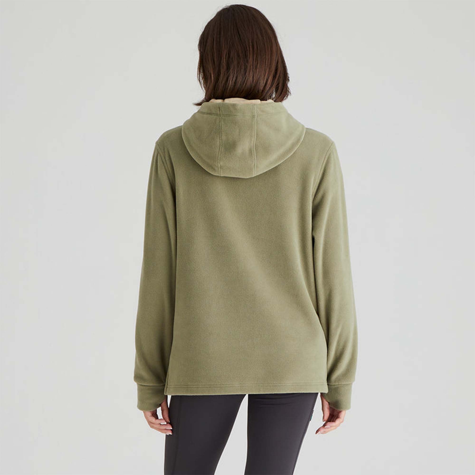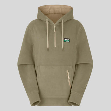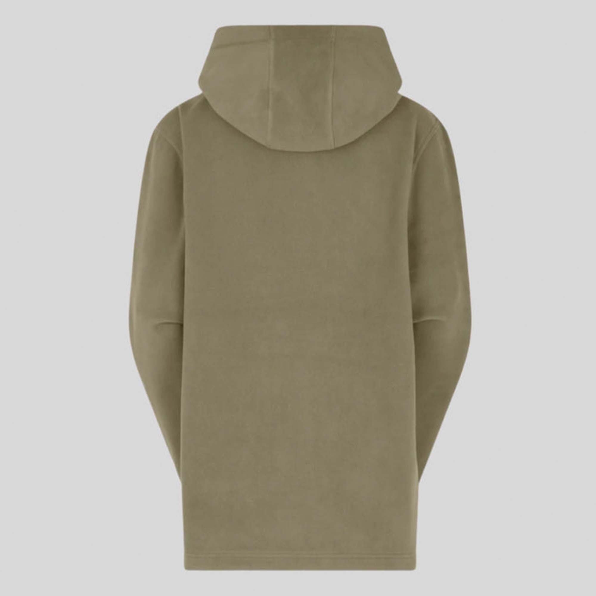 Lightweight, warm and highly breathable, it features a a 1/4 zip front and a large, double-thickness hood — thick “boot lace” ties cinch it in for extra cosiness.