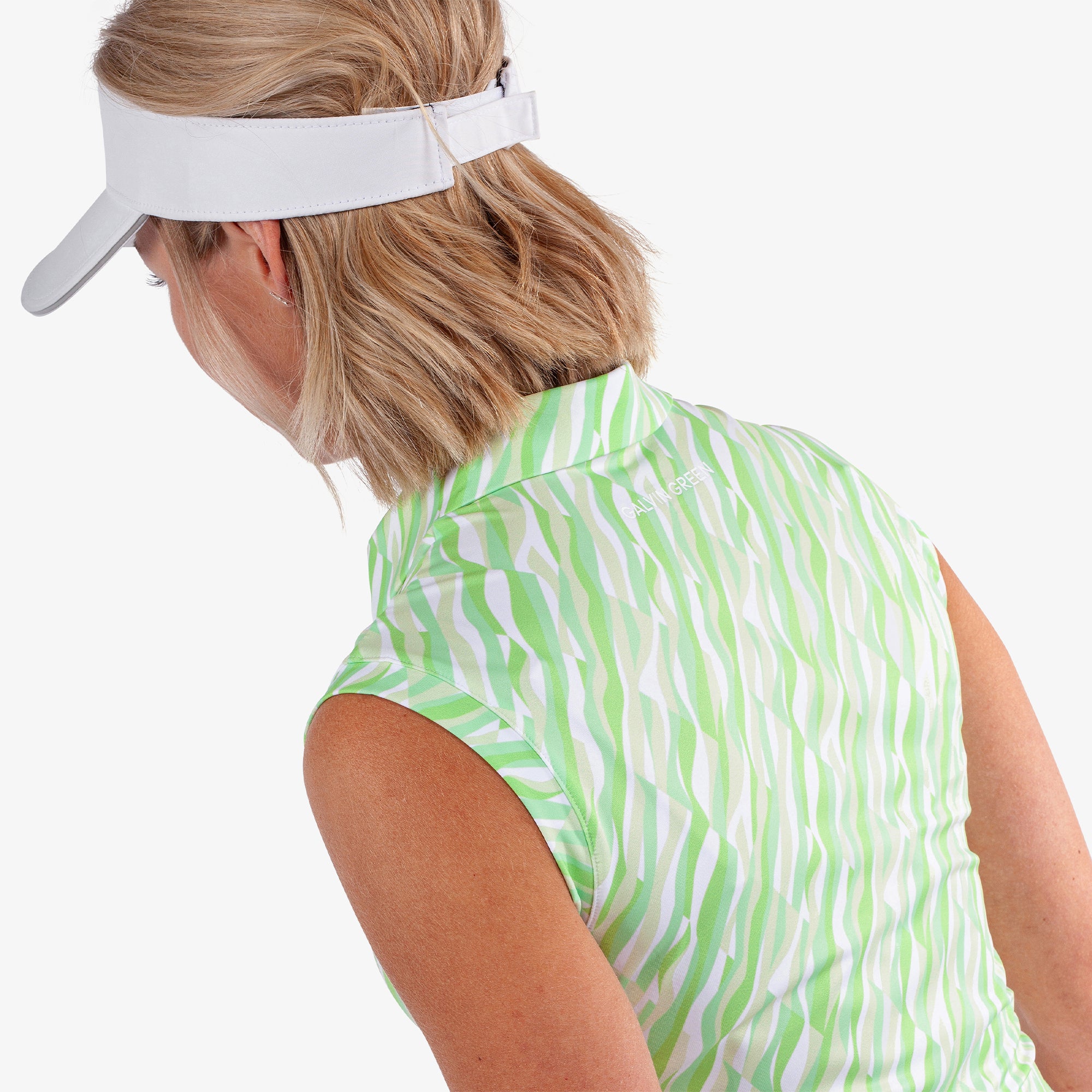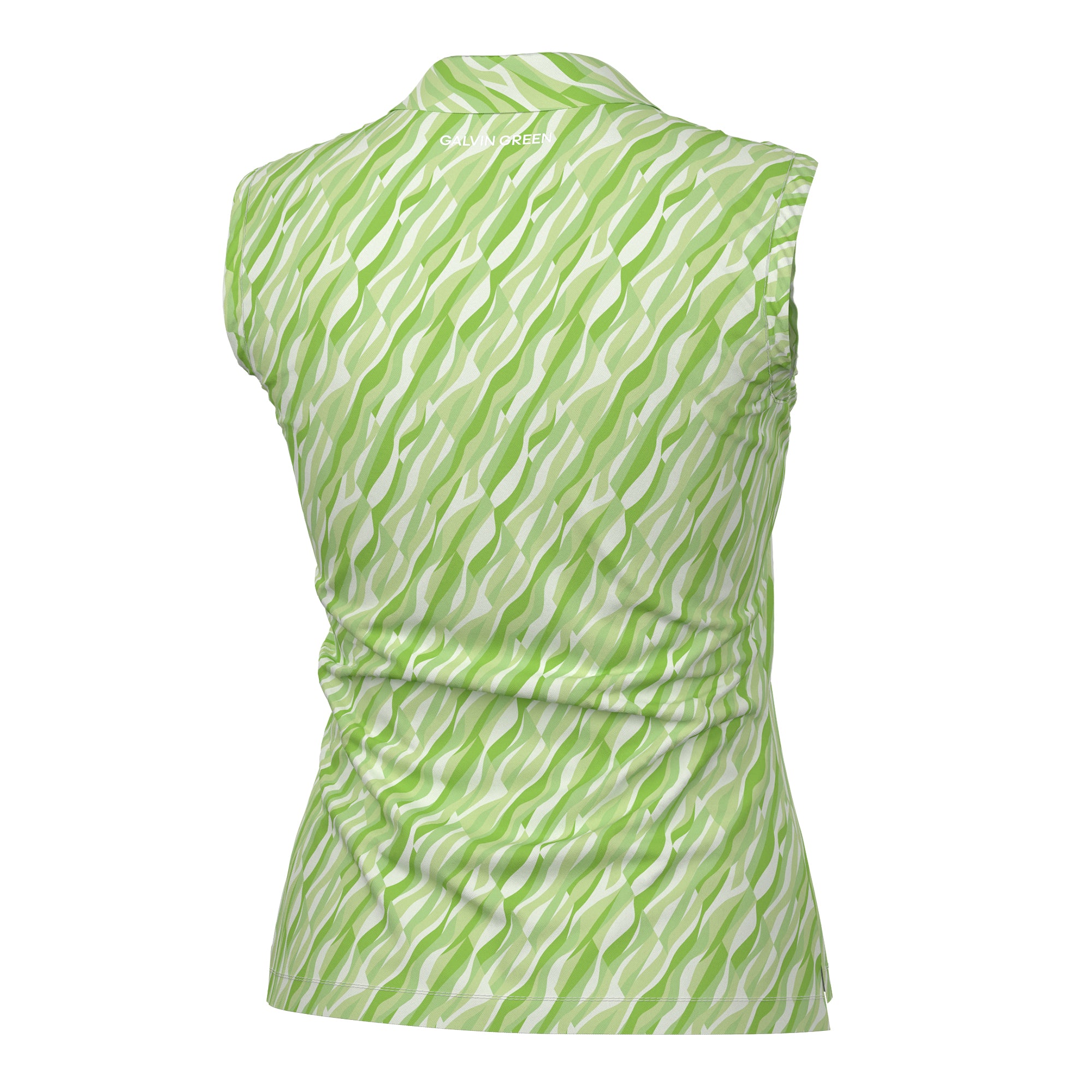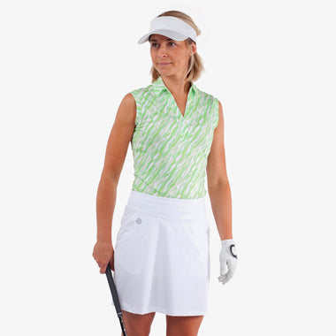 The Melissa shirt's print features angled geometric argyle shapes inset with curving lines reminiscent of the soft meadows of a golf course. Made from stretch fabric, it offers exceptional breathability and quick-drying comfort, keeping you fresh throughout the day.